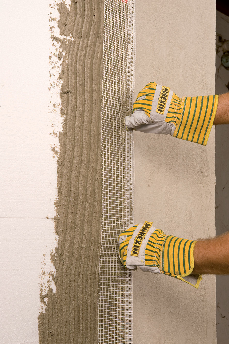 Pred celoplošným vystierkovaním sa do pásu lepiacej malty osadia rohové a odkvapové lišty. Na rohoch sa uloží dvojmo sklotextilná mriežka. Presah za roh má byť min. 200 mm (pri rohovej lište s integrovanou výstužou 100 mm).