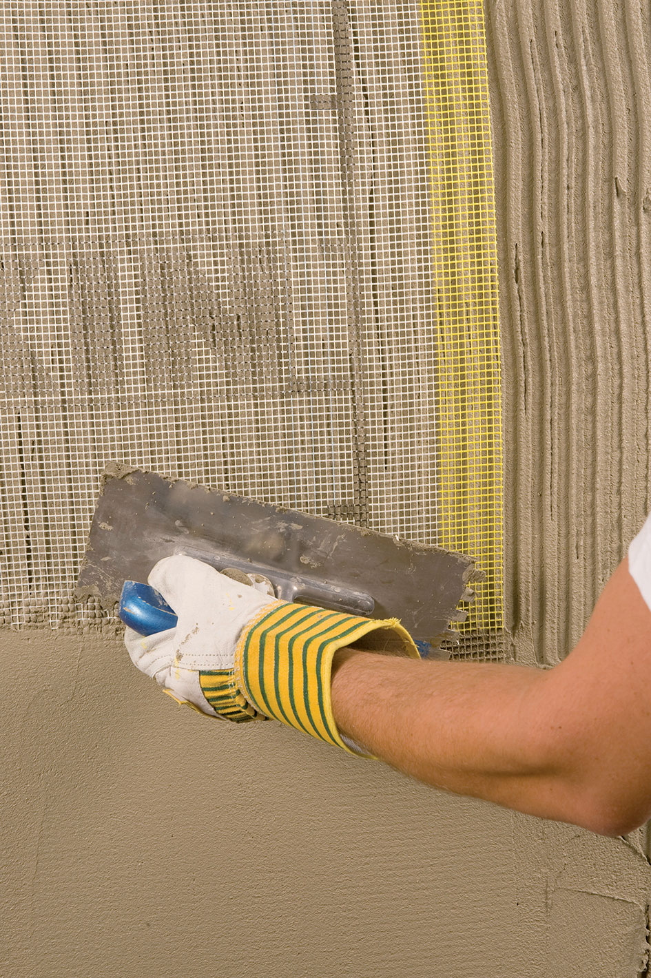 Na izolačné dosky sa oceľovým zubovým hladidlom (veľkosť zuba 10 × 10 mm) nanesie lepiaca stierka, do ktorej sa vloží sklotextilná mriežka nastrihaná na pásy s potrebnou dĺžkou. Pásy sa kladú so vzájomným presahom 100 mm. Mriežka sa hladidlom zatlačí do stierky a dôkladne zahladí (celková hrúbka 3 a 4 mm).
