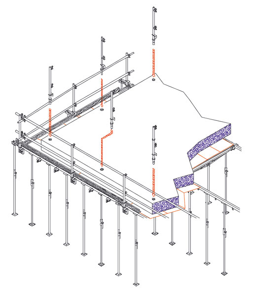 Práce prebiehajúce na horizontálnom debnení musia zohľadňovať konfiguráciu a nosnosť použitého podperného systému. Ťažké prvky, ako napr. tyčovú výstuž, treba rozmiestňovať rovnomerne v menších zväzkoch. V prípade, že ide o veľké profily alebo z časového hľadiska nasadenia žeriava nie je možný transport po menších celkoch, musí sa určené miesto vykládky výstuže podľa statických výpočtov zosilniť. Ďalším príkladom môže byť nutnosť posunu koša na čerstvý betón pri jeho vyprázdňovaní na eliminovanie lokálneho zaťaženia.