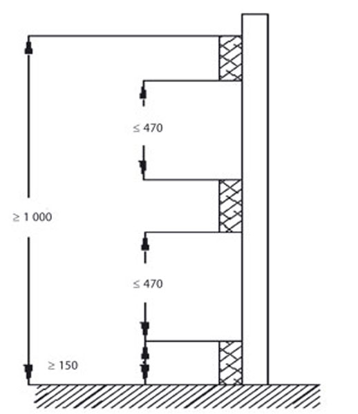 Európska norma EN 13374: 2004 – Temporary Edge Protection Systems ukladá pre konštrukcie triedy A (sklon do 10°) tieto rozmerové požiadavky zábradlia: