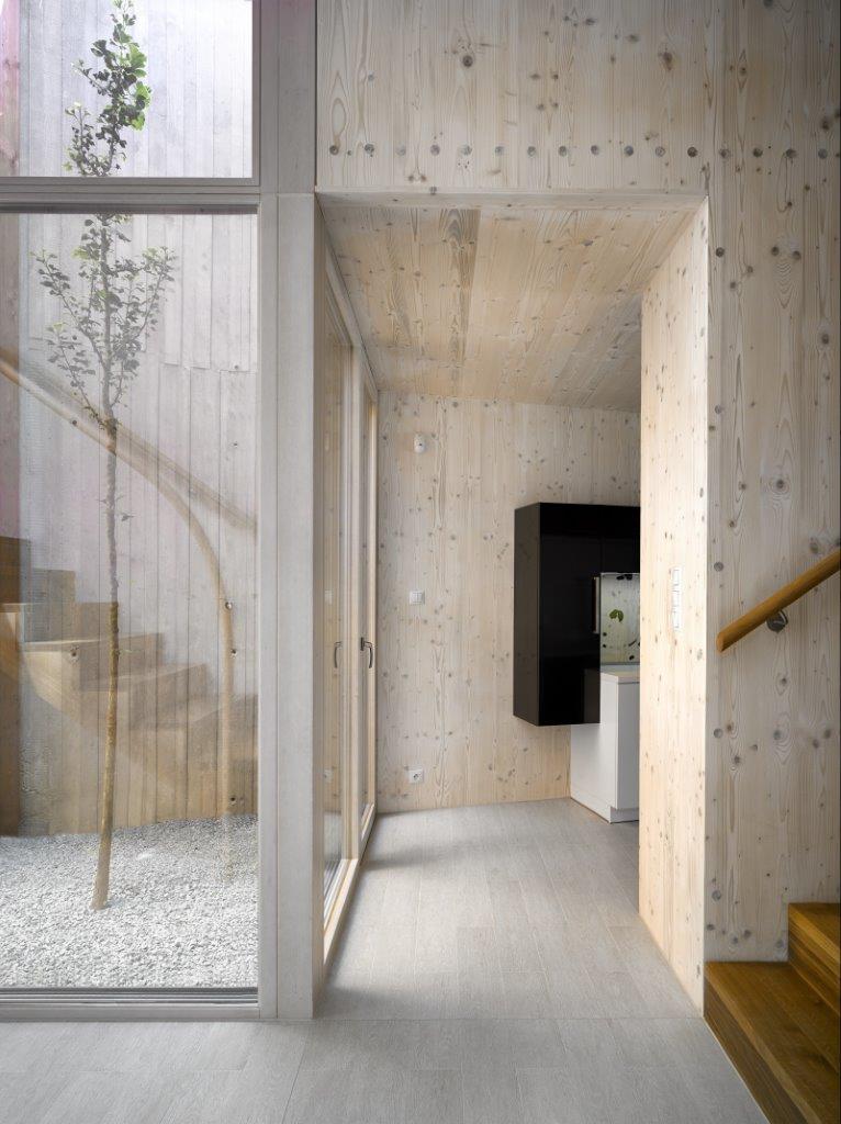 NOVATOP prezentuje svoj systém slovami: „V každom paneli je skutočný strom“. Preto jeden rastie aj vnútri Domu v úžine. Áno, na prvý pohľad je toto tvrdenie hlúpe! Symbolika – a myslím si, že inak to nie je ani v japonskej architektúre – nemôže byť predsa určujúcim dôvodom. Strom vypovedá o vzťahu k prírode a prináša domov „život“. Dokáže rozohrať hru svetla a tieňov. Prekvapuje! Je úžasné sledovať jeho zmeny v priebehu roku a rokov. Starne spolu s domom! Pričleňuje vonkajší priestor k interiéru a drevený dom osvetlený cez vetvy má neopísateľnú atmosféru. Udržuje vlahu, klímu a v okamihu, keď vyrastie a rozkošatí sa, snáď bude i čistiť vzduch. Jednoducho vytvára prirodzené pľúca domu bez nutnosti inštalácie technických zariadení. Ide o jeden z výsledkov konceptu, keď sme sa snažili nahradiť technické riešenia prirodzenými cestami.