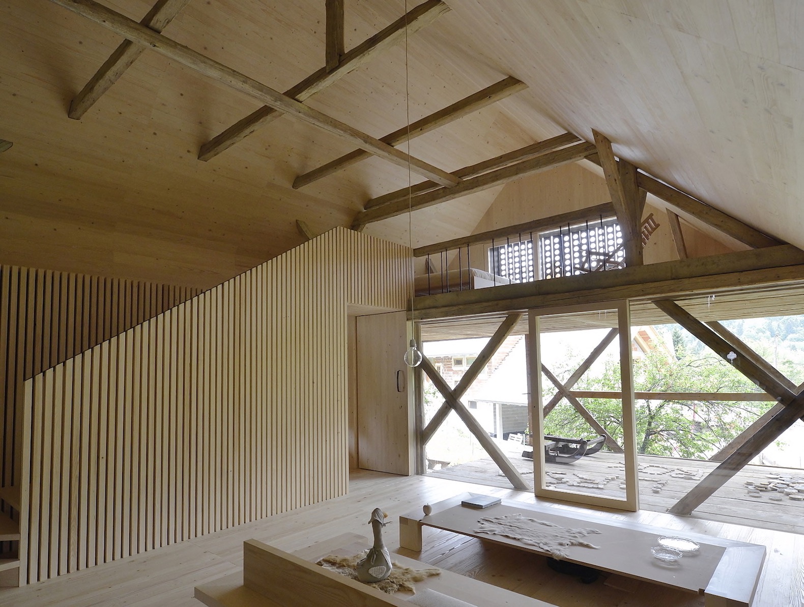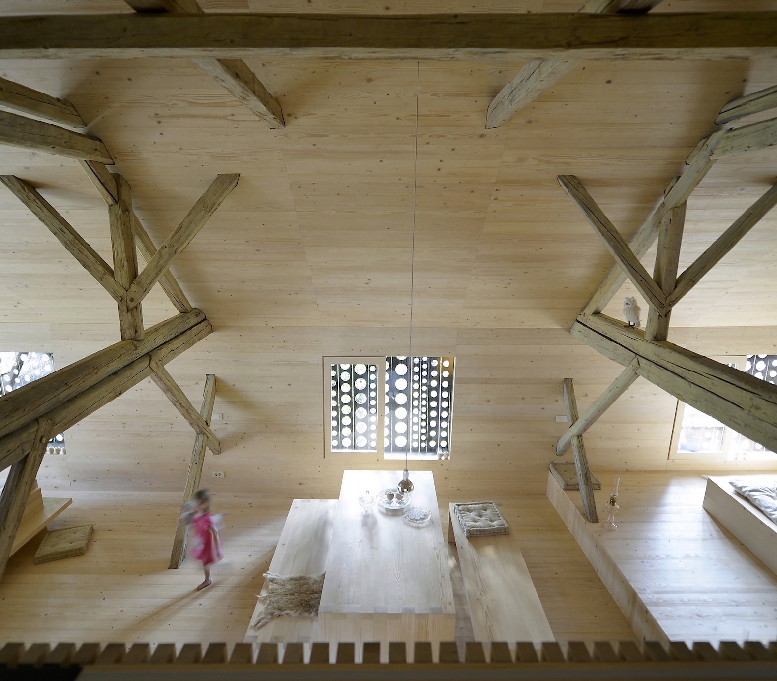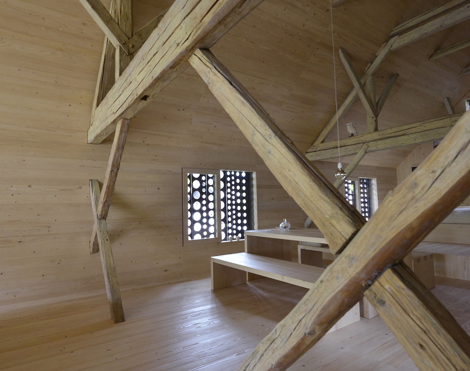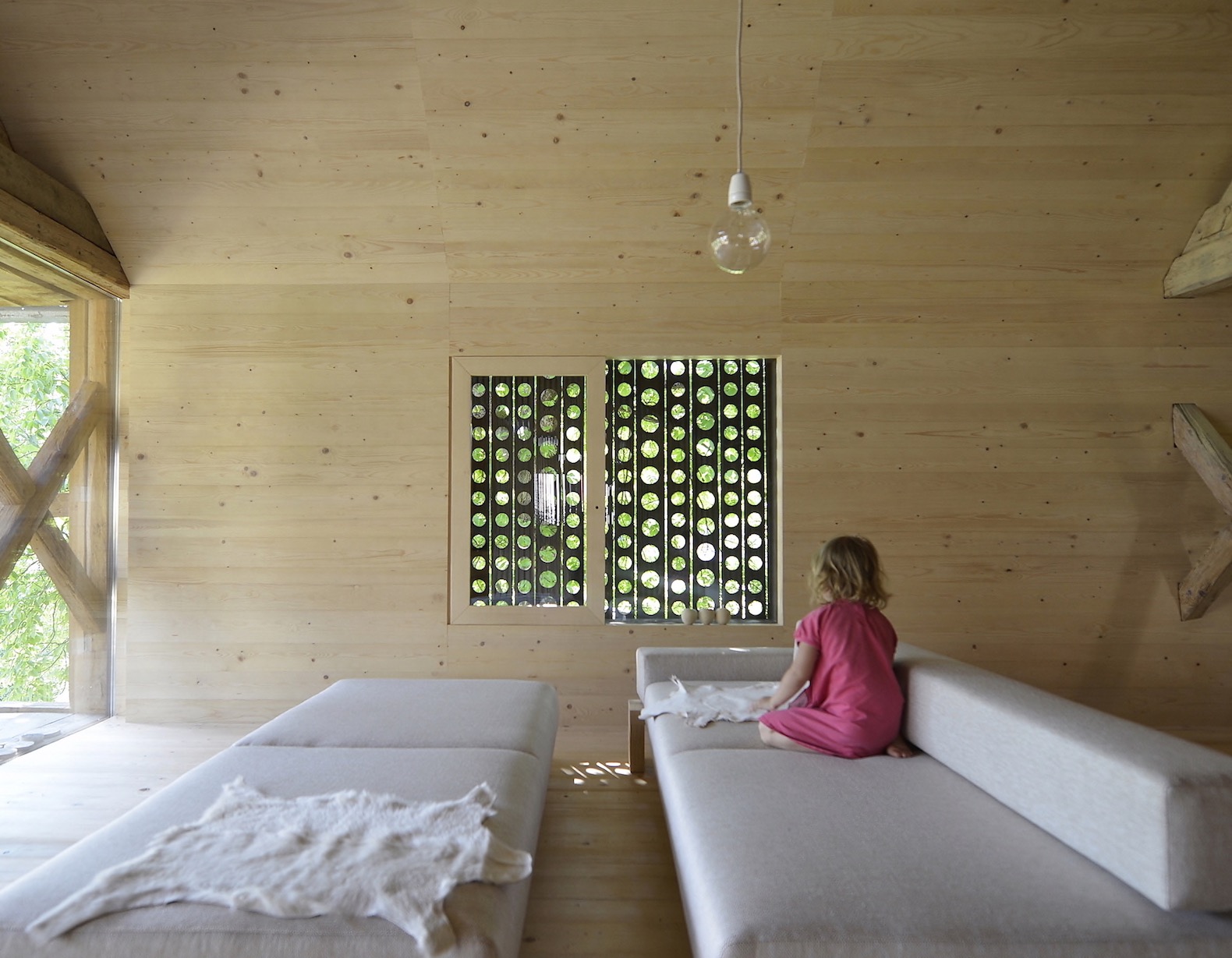 Všetky interiérové obklady, podlahy a nábytok boli vyhotovené zo smreku z okolitých zdrojov.