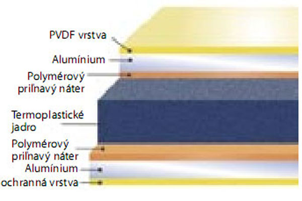 Kompozitný materiál pozostáva z exteriérových a interiérových alumíniových plechov, medzi ktorými sa nachádza termoplastické jadro (obr. 7). Toto materiálové zloženie tvorí mechanickú a chemickú väzbu, ktorá dáva fasádnym a interiérovým prvkom vysokú tuhosť a súdržnosť. Alumíniové kompozitné materiály majú nízku hmotnosť, plošnú rovinnosť, lineárnosť a vysokú odolnosť proti poveternostným vplyvom. Fasádne kompozitné alumíniové prvky sú zo strany exteriéru chránené fluorokarbónovým povlakom (náterom) – PVDF, alternatívne iným typom vyhotovenia povrchovej úpravy. Povrchová úprava má vysokú mieru odolnosti proti poveternostným vplyvom a priemyselnému znečisteniu. Hrúbka kompozitných fasádnych a interiérových materiálov môže byť od 3 mm do 6 mm v závislosti od ich použitia, štandardne však 4 mm. Výrobcovia ponúkajú tabule vo farebnom vyhotovení bez efektov, so špeciálnymi efektmi alebo v metalickom variante, ale aj s povrchovou úpravou evokujúcou drevo, v anodizovanom alebo prirodzenom hliníkovom variante.