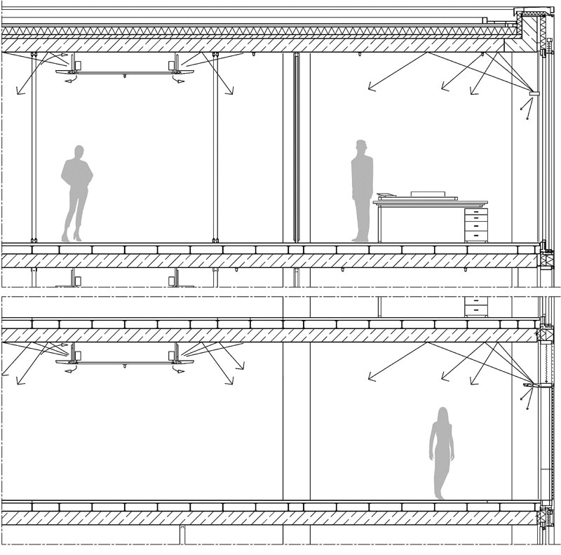 Z celého roka, ktorý má 8 760 hodín, pokrýva prevádzka kancelárskej budovy maximálne 25 %. Vo zvyšnom čase je potrebné, aby budova rozumne hospodárila – napr. v piatok, keď zamestnanci odchádzajú domov okolo 14.00 hod., môže vonkajšia teplota vystúpiť cez víkend aj na 40 °C. V pondelok ráno sa zamestnanci vracajú do práce a chcú mať vychladenú kanceláriu. Budova by mala vedieť, ako sa správať, keď je prázdna. Dobre naprogramovaný softvér spustí tienenie, budova sa hermeticky uzavrie a len v určitý nočný čas vpustí dovnútra vzduch. V Nemecku sa na tému možnosti priameho vetrania vedú búrlivé diskusie. Architekt Elmar Schossig zastáva názor, že ten, kto sedí vnútri budovy, nemôže pri vonkajšej teplote 40 °C otvoriť okno a počúvať cvrlikanie vtáčika.