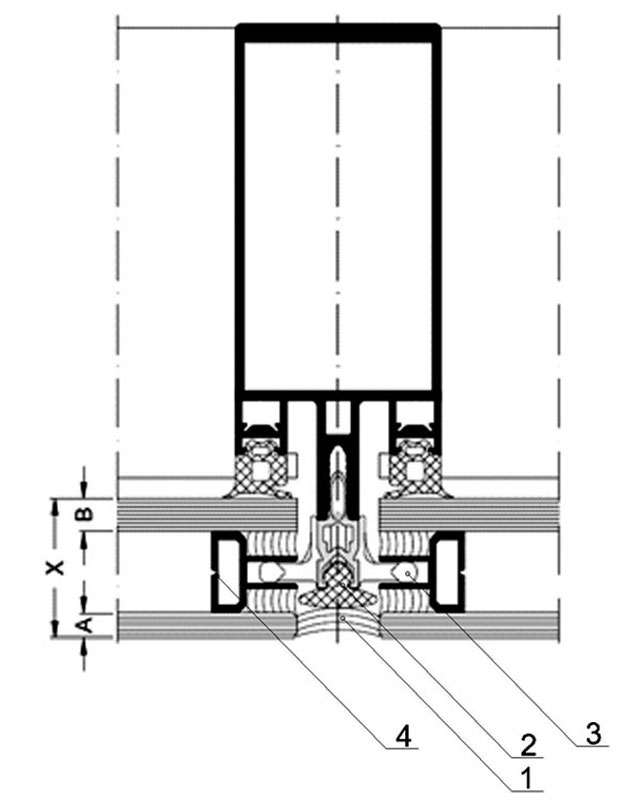 | Obr. 5 Detail štrukturálnej fasády kombinovanej so vstupnými automatickými dverami 1 – hliníkový fasádny profil, 2 – oplechovanie zateplenia hliníkového profilu, 3 – tmelená škára, 4 – automatické dvere |