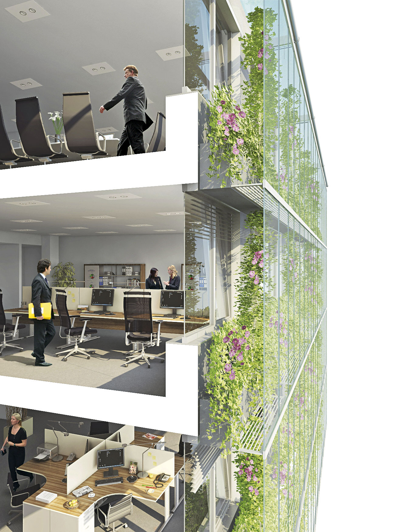 Návrh fasády bol okrem požiadavky na pohodlnú údržbu vykonávanú nezávisle od prevádzky kancelárií obmedzený najmä tepelnotechnickými podmienkami v priestore zdvojenej fasády, kde rastú rastliny.