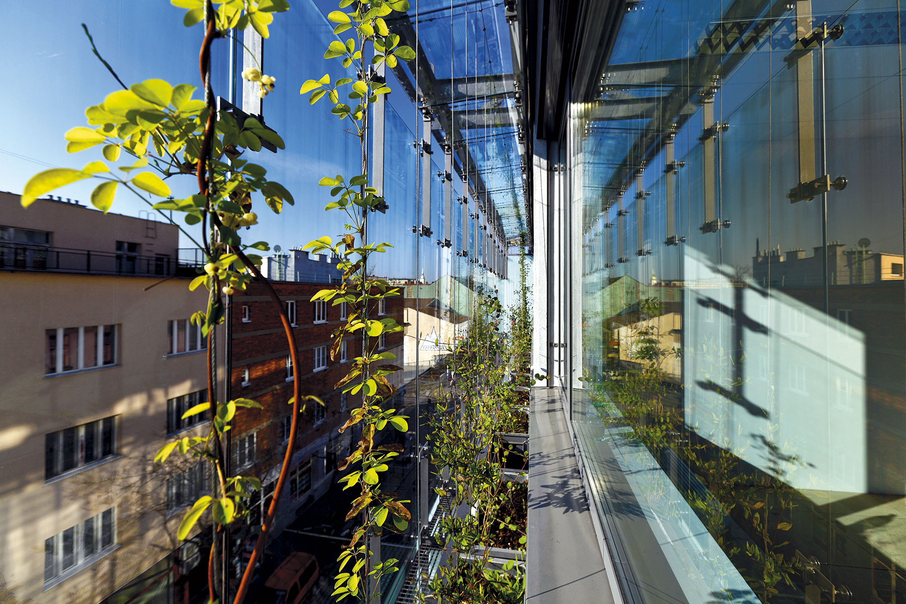 Základnú konštrukciu tvoria oceľové rámy kotvené do fasády, ktoré nesú priebežné kvetináče z antikora. Pred nimi sú umiestnené póroroštové lávky, ktoré umožňujú pohodlný prístup pri údržbe. Zasklenie sa realizovalo bodovo uchytávanými bezrámovými tabuľami skla.