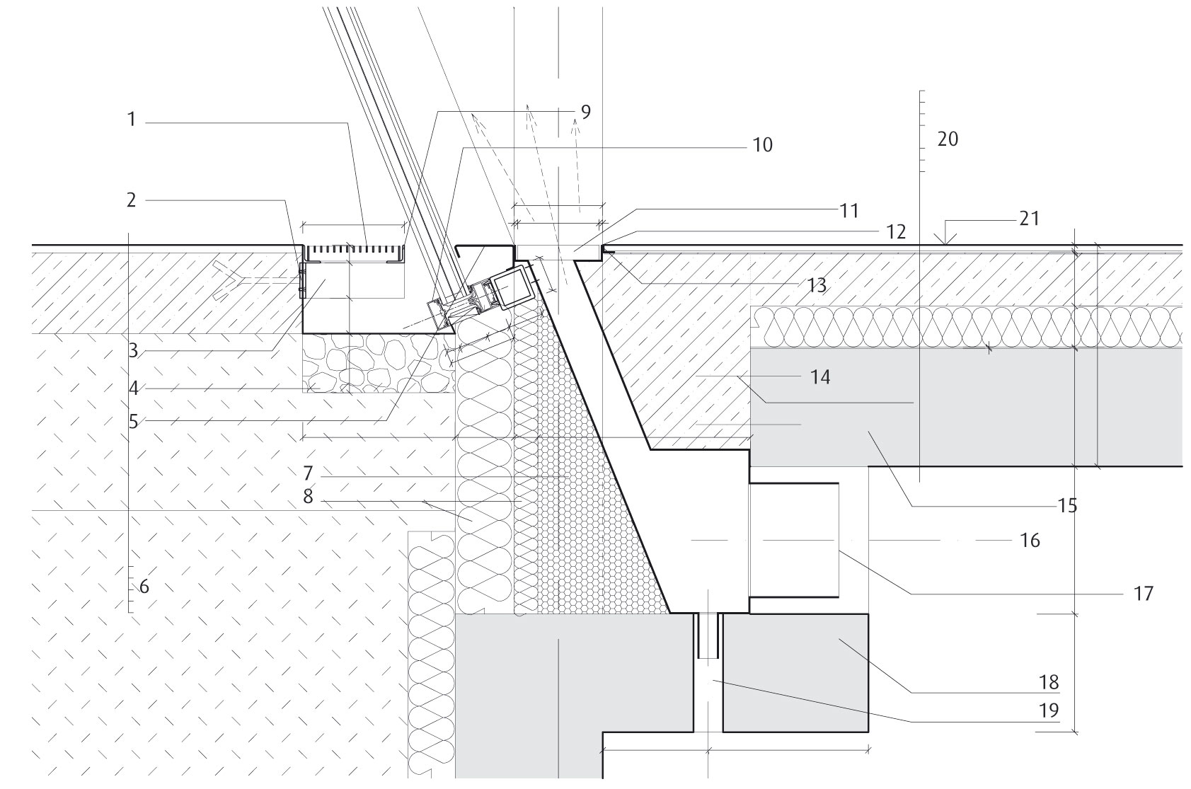 10 Hliníková fasádna konštrukcia typu stĺpik – priečny trám s pohľadovou šírkou profilov 50 mm, vodorovný priečny trám s nízkou uzatvorenou prítlačnou lištou osadený pod úrovňou priliehajúceho terénu