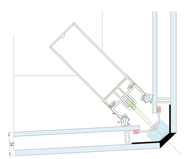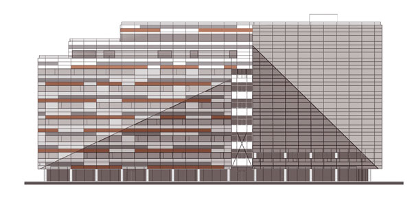 Najzaujímavejšie pohľady ponúka stavba z čelnej strany, kde sa vyníma vlnenie aj sklon fasády a šírková variabilnosť stropných konzol. Uplatnili sa tu dva systémy – trojkomorový systém pre vonkajšie dvere a systém zasklenej steny. Jeho súčasťou sú nepriehľadné diely s oceľovou povrchovou úpravou, tepelnou izoláciou a protipožiarnou ochranou. Na tieto diely sa nitovaním upevnili eternitové pásy. V rámci celej fasády sa použil systém so štrukturálnym zasklením. Charakteristické preň sú profily, ktoré sú z vonkajšej strany decentne ukryté za sklenými plochami. Kým vertikálne spoje zabezpečujú flexibilné nepriedušné profily, vodorovné spoje využívajú profily s hliníkovou úpravou. Vytvárajú tak jemný náznak horizontálnych línií.