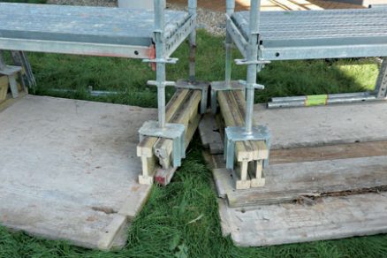 Zaujímavosťou na projekte Tri veže bola najmä výška lešenárskej konštrukcie (60,63 m). Preto sa lešenie nestavalo na pätky, ale na krížové hlavy a na dosky, čím sa zabezpečilo rozloženie zaťaženia (obr. 4 a 5).