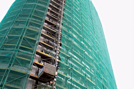 Pri vrchole budov sa realizovalo lešenie s výškou 6 m bez priameho kotvenia do budovy (obr. 6). Umožnilo to spevnenie širokými diagonálami a kotvením do atiky. Medzery medzi poľami sa vyplnili preglejkou. Na kotvenie sa použili kotvy dlhé 350 mm. Na objekte bolo použitých 9 000 m2 bezpečnostných lešenárskych sietí.