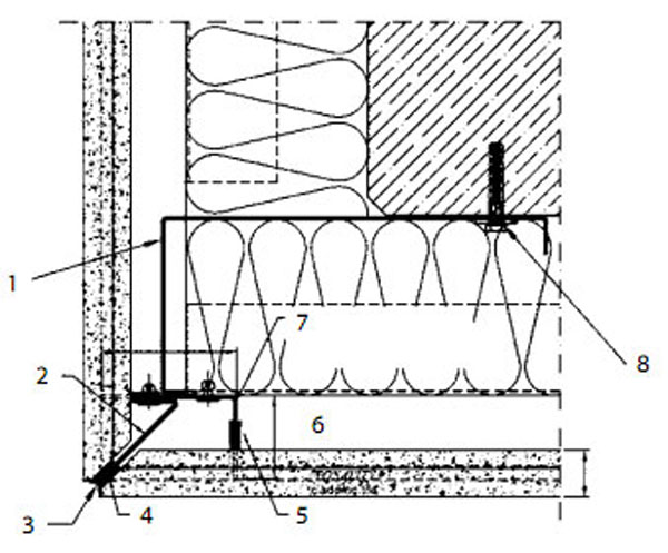 | Obr. 1 Hrúbka fasády závisí od navrhovanej hrúbky tepelnej izolácie | Obr. 2 Ochrana vzduchovej medzery proti vetru 1 – vertikálna veterná bariéra pozdĺž vertikálnej hrany budovy aplikovaná podľa NTA (BIFI) a DIN 18516, 2 – tesnenie, 3 – vertikálny externý rohový profil s tesnením a spojovací profil, 4 – stredový spojovací profil, 5 – podporný profil, 6 – trvalé vetranie, 7 – vertikálny podporný externý profil, 8 – kotva každých 60 cm, vzdialenosť od hrany závisí od typu kotvy, aká sa navrhuje  |
