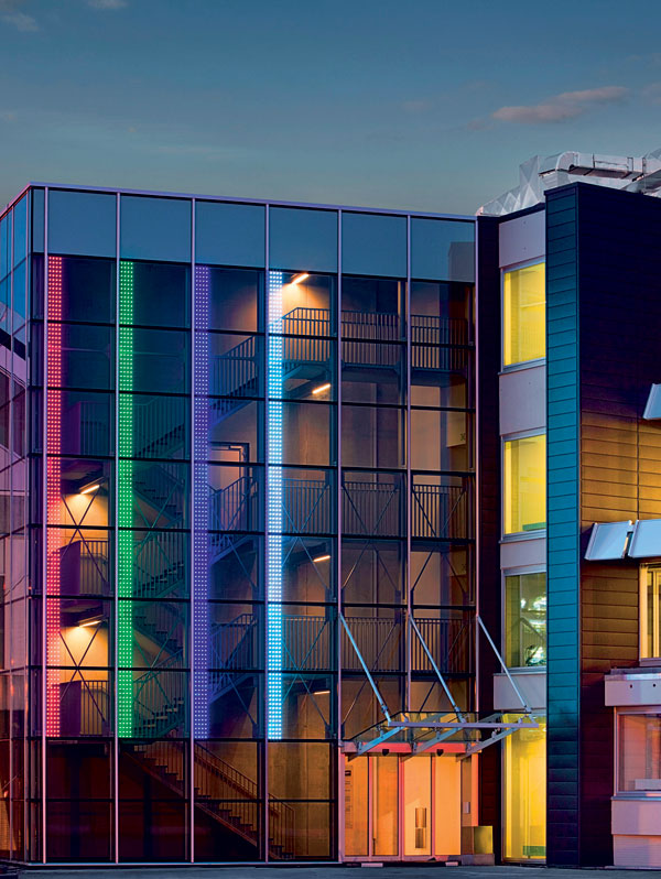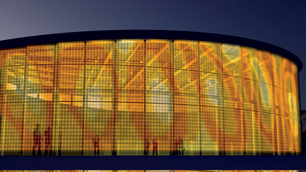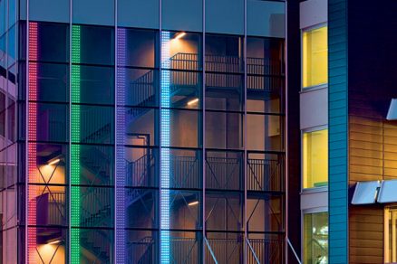 Jednou z možností, ako umocniť vzájomné pôsobenie medzi budovou a okolím, je použitie vrstveného skla so zabudovanými LED diódami. Podstatou tejto technológie je integrácia LED diód do vrstveného skla. Na fasády sa používajú diódy s vysokým výkonom pre dekoratívne, signalizačné či osvetľovacie ciele. Jednotlivé LED diódy sú medzi sebou prepojené vysoko výkonným neviditeľným vodivým povlakom a poskytujú tak nielen svetlo, ale aj pôsobivý efekt priehľadnosti.