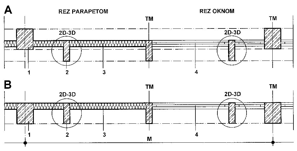 1 – hlavný nosný stĺp skeletu, 2 – vertikálny pilaster, 3 – obvodová stena, 4 – transparentná konštrukcia, TM – tepelný most, 2D-3D – viacrozmerné tepelné toky