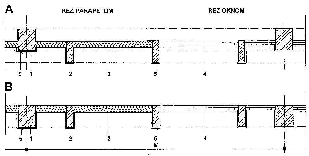 A – pilastre a hlavný vertikálny nosný systém sú v rôznej úrovni, B – pilastre a hlavný vertikálny nosný systém sú v rovnakej úrovni