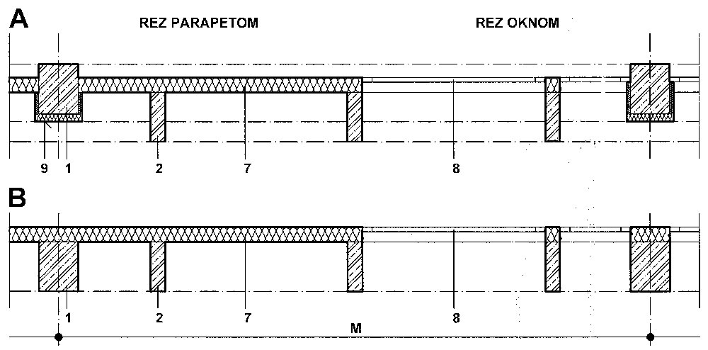 1 – okenný systém s integrovaným krídlom na báze zliatiny hliníka s prerušeným tepelným mostom (ref. profil Schüco AWS 75 BS.HI), 2 – vonkajší okenný AL parapet, 3 – paropriepustná fólia, 4 – tepelná izolácia, 5 – paronepriepustná fólia, 6 – vnútorná parapetná doska, 7 – oceľový rám z  profilov Jäkl 40 × 60 mm, 11 – kotviaca rozperka, 13 – kotviaca rozperka, 14 – tenkovrstvová silikátová omietka, 15 – polyuretánová pena, 16 – kotvenie okenného rámu, 17 – sadrokartón, 18 – kotvenie okenného rámu L-uholníkmi, 19 – krycí AL plech, 20 – nadokenná lišta s odkvapovým nosom, 21 – vonkajší ukončujúci omietkový profil, 22 – podkladový osadzovací h-PVC profil, 23 – prerušenie tepelného mosta