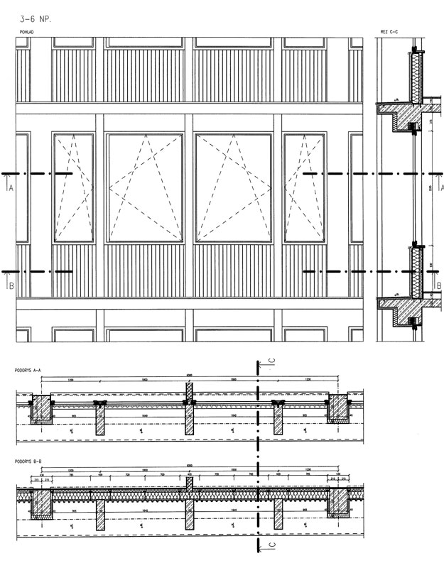 • variant V3-A2 s totálnou výmenou obvodovej steny (vrátane parapetnej časti) ­realizovanej z kompletizovaných dielcov, osadených na úroveň vnútorných povrchov vertikálnych pilastrov (obr. 8).