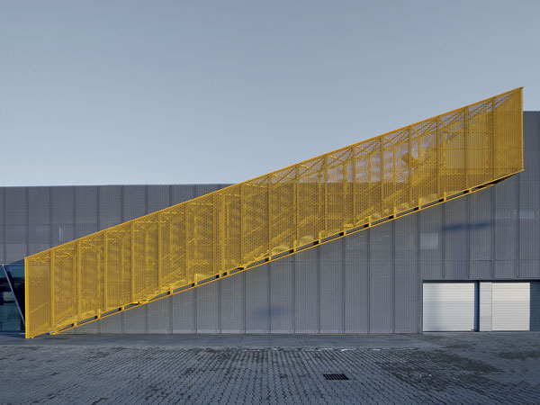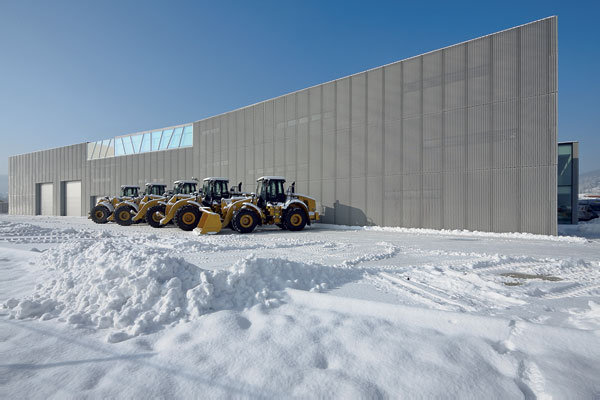 Uzavretosť fasád s prevažne úzkymi štrbinovými oknami je podporená použitím metalického obkladu na báze membrán z perforovaného hliníkového plechu – ťahokovu, ktoré sú v miestach významného tvarovania hmoty doplnené plochami kompaktných dosiek sýtej žltej farby. Ťahokov fasády opticky zjednocuje, robí stavbu s viacerými integrovanými prevádzkami kompaktnou, funguje ako tieniaci systém okien, ktoré prekrýva, a slúži aj ako celistvé pozadie na prezentáciu farebne a tvarovo výrazných stavebných strojov. Za pekného počasia ťahokov zaujímavo odráža slnečné lúče a povrchy budovy žiaria dúhovou kresbou, meniacou sa s pohybom pozorovateľa. Kompozíciu fasády dotvára exteriérové požiarne schodisko na jej západnej strane. V zmysle platných protipožiarnych predpisov umožnilo toto riešenie vytvoriť hlavné vnútorné schodisko otvorené, bez nevyhnutnosti budovať chránenú únikovú cestu s požiarnymi uzávermi.