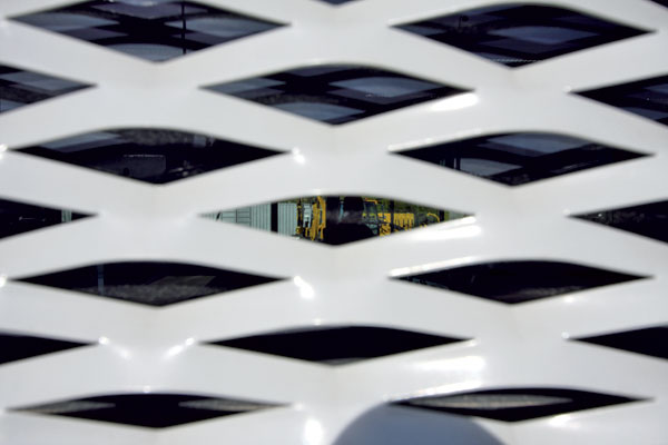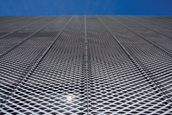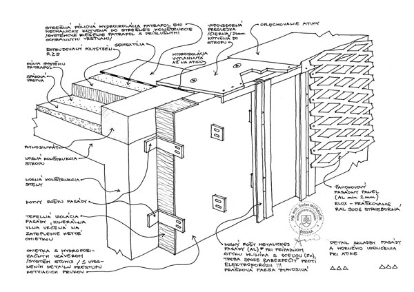 o fasádeAutori projektu majú radi jednoduché, čisté, skulpturálne stvárnené formy. Pri takomto zložitom objekte, v ktorom je umiestnených množstvo rôznych technologických zariadení, otvorov, nasávaní a výduchov, bol potrebný silný nástroj, ktorý by pomohol zjednotiť povrchy a umožnil relatívne slobodné formovanie hmôt. Pre Zeppelin sa preto jeho autori rozhodli navrhnúť ťahokovovú hliníkovú predsadenú fasádu. Keďže sa im nepodarilo nájsť nič typové, navrhli vlastné riešenie fasády. Ide o individuálne atypické riešenie z hliníkového plechu s hrúbkou 2 mm, ktorý sa po konečnom sformovaní povrchu upravil práškovou farbou. Fasáda je zároveň aj súčasťou tienenia budovy. Tienenie predstavuje prostriedok na zabezpečenie kvalitnej vnútornej pohody budov, dobrého pracovného, prípadne obytného prostredia, ochranu proti neprimeranej insolácii a tepelným ziskom v lete. Návrh je ukážkou koordinácie požiadaviek tepelnej techniky, stavebnej fyziky a, samozrejme, celkového architektonického konceptu. V prípade budovy spoločnosti Phoenix Zeppelin ide o kombináciu fixného ťahokovového plášťa, ktorý okrem iných funkcií plní aj funkciu primárneho tienenia a interiérových sťahovacích roliet, ktoré bránia v prípade potreby odleskom na pracoviskách. Súčasťou systému bol aj starostlivý výber parametrov zasklenia obvodového plášťa (najmä faktor g). Realizoval sa stavebnofyzikálny výpočet vnútornej klímy. Sklo odráža 70 % IR-zložky slnečného žiarenia, súčiniteľ prechodu tepla zasklených častí fasády U = 1,1 (W/(m2 . K)).  |