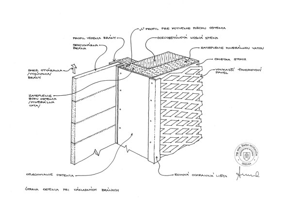 | o práci „Potvrdila sa skutočnosť, že architektúra je okrem iného najmä o komunikácii. A o partnerstve. Architekt musí nielen uskutočniť predstavy investora, ale aj vedieť argumentovať, presvedčiť o výhodách riešení, aby výsledok bol čo najlepší. Na druhej strane potrebuje ku komunikácii inteligentného partnera. To sa v tomto prípade podarilo v podobe generálneho riaditeľa spoločnosti. Niežeby vzťahy boli idylické. Investor je excelentný obchodník. Investičné prostriedky a nákladové položky boli striktne stanovené, neprekročiteľné a neúprosne kontrolované. Vyjednávať a presadzovať riešenia nebolo jednoduché. Ak sa však podarilo nájsť architektonicky vhodnú alternatívu preferovanú architektmi bez vplyvu na celkový finančný balík, zvyčajne sme sa vždy dohodli,“ opisuje spoluprácu Štefan Moravčík. „Prioritou zadania boli funkčné požiadavky. Budova musela bezchybne plniť svoje poslanie. Dôraz sa kládol na čistú dispozíciu a precízne prevádzkové väzby. Samozrejme, našou ambíciou bolo priniesť aj niečo viac. Sme radi, že aj pri takom prozaickom zadaní, akým je priemyselná stavba, sme dokázali okolie presvedčiť o potrebe nadstavbových hodnôt v architektúre. Najmä o tom, že to nie sú fiktívne pojmy, ale že takýto prístup prináša reálne výsledky napríklad pri vytváraní podnetného a príjemného prostredia na prácu, že budova môže byť reálnym marketingovým nástrojom vytvárajúcim imidž spoločnosti a že ani priemyselná zóna nemusí byť priestorom bez kultúrnych ambícií,“ dodáva Štefan Moravčík.  |