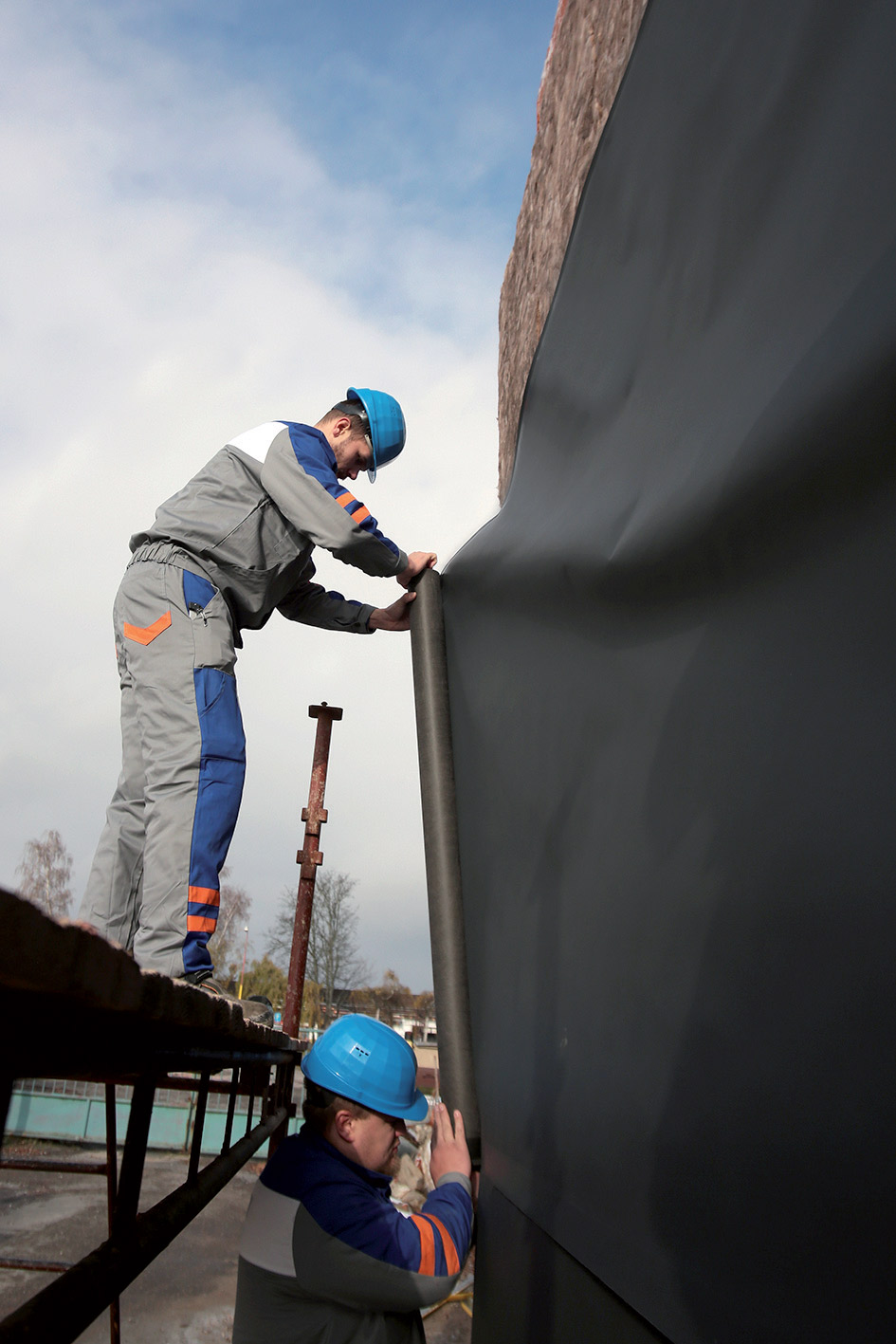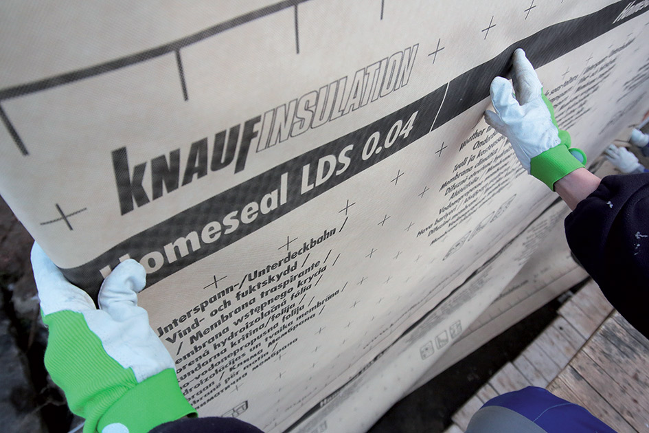 Na profily L sa pomocou obojstranne lepiacej pásky položí difúzne odvetraná vetrotesná fólia. Pod škárovo otvorené varianty opláštenia je potrebné použiť fóliu odolnú proti namáhaniu UV žiarením.