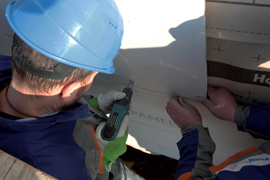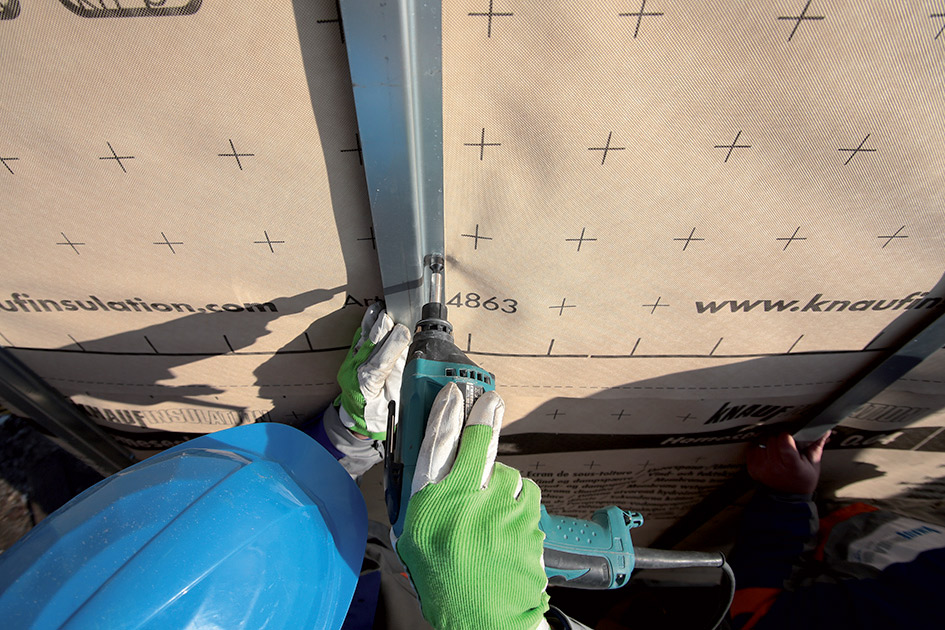 Na vetrotesnú fóliu sa zvislo namontujú vonkajšie profily Z. Tým sa stuží pásnica priehradovej sústavy, vymedzí sa šírka zvislej prevetrávanej medzery a vytvorí sa podklad na montáž pohľadového opláštenia.