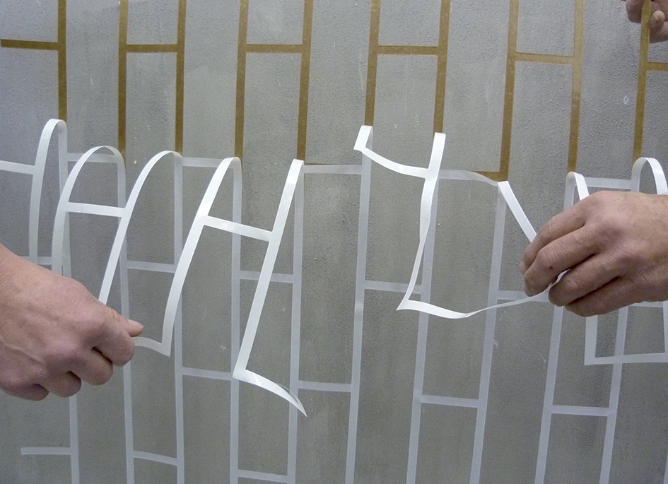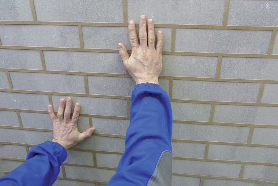 Na takto pripravený a zaschnutý podklad sa nalepí špeciálna samolepiaca šablóna. Pri lepení šablóny treba byť opatrný, nesmie nikde od podkladu odstávať. Umiestnenie šablóny treba dopredu premyslieť a vymerať. Inak sa môže stať, že tehly budú v pohľadovej časti odrezané. Šablóna sa dodáva v jednotlivých kusoch s plochou 1 m2 a môže sa deliť na menšie časti rozstrihnutím.