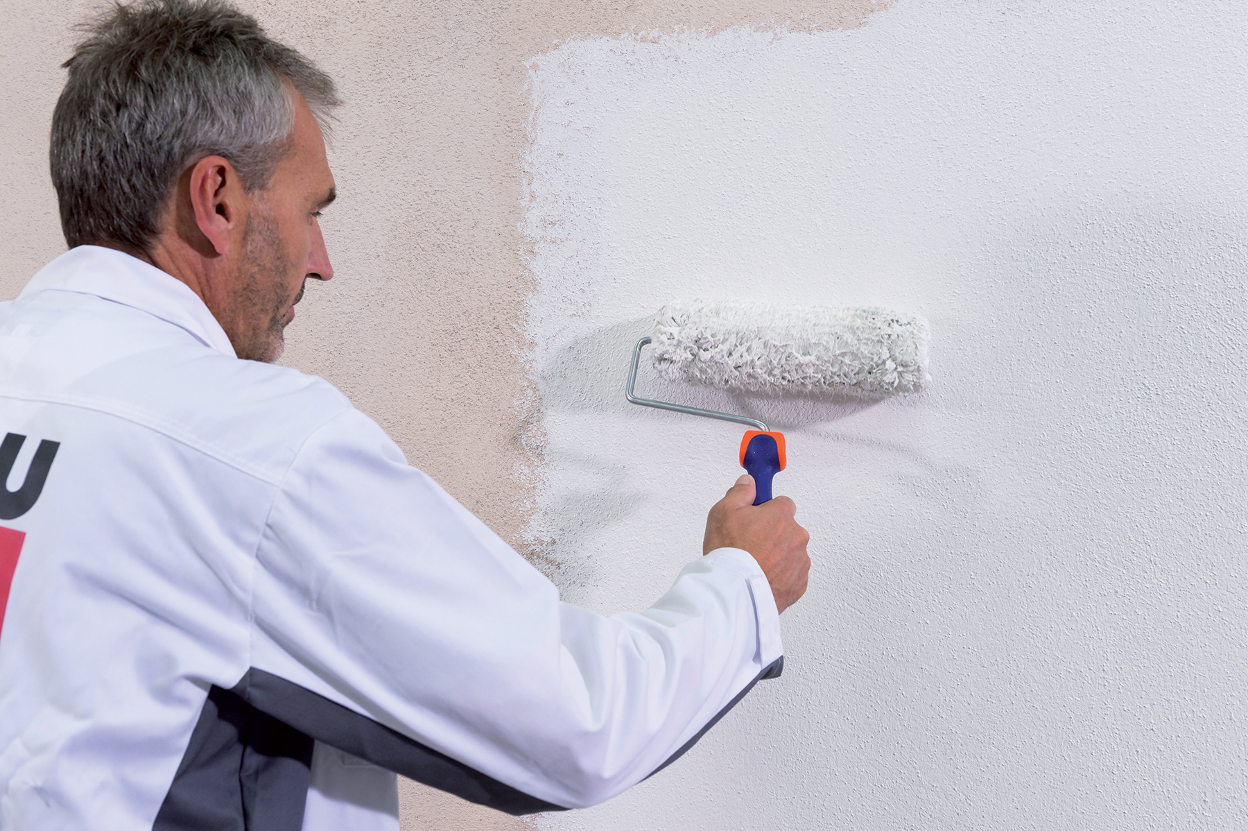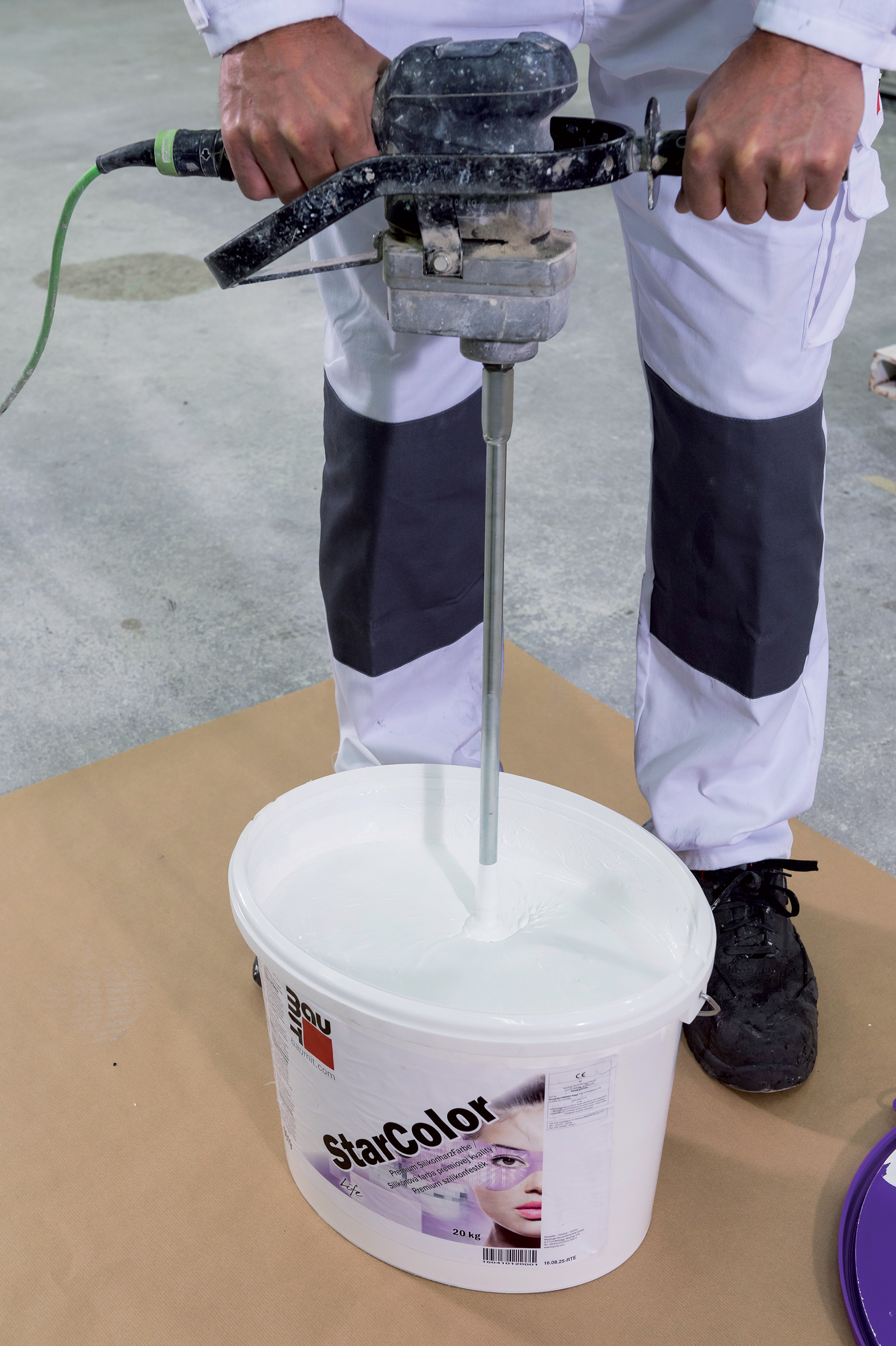 Po zaschnutí základného náteru (technologická prestávka min. 12 h) sa aplikuje fasádna farba. Bezprostredne pred nanášaním fasádnej farby sa obsah vedra dôkladne premieša elektrickým miešadlom s nízkymi otáčkami. Valčekom alebo štetcom sa na pripravený podklad nanesie rovnomerne bez prerušenia základný náter fasádnej farby. Nasleduje technologická prestávka približne 12 h. Potom sa nanesie jedna až dve vrstvy krycieho náteru neriedenej farby (v prípade potreby riedenie s max. 5 % vody).