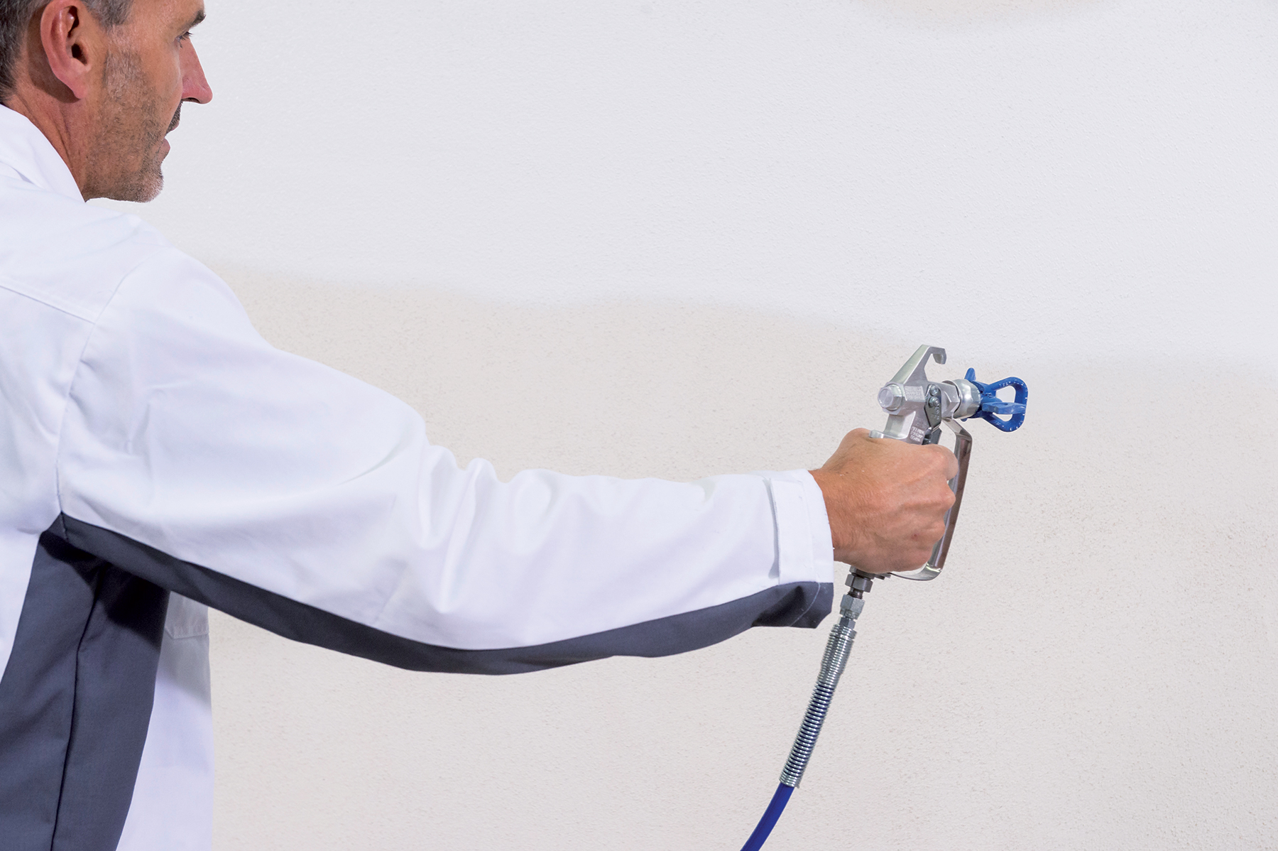 Na strojové nanášanie sa použije striekacie zariadenie s technológiou airless (napr. Graco UM II 795 PC). Neriedená silikónová fasádna farba sa nanáša rovnomerne bez prerušenia v dvoch vrstvách v jednom pracovnom cykle tzv. krížovým spôsobom, aby sa docielilo rovnomerné prefarbenie povrchu.