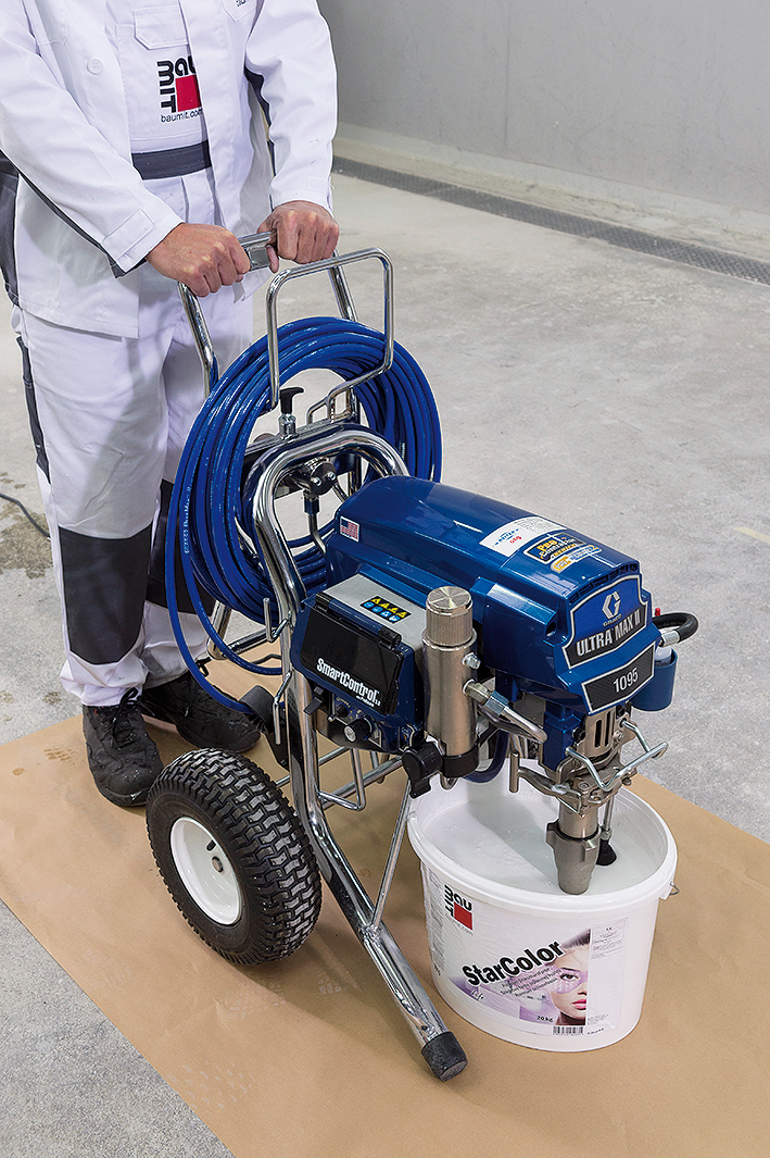 Na strojové nanášanie sa použije striekacie zariadenie s technológiou airless (napr. Graco UM II 795 PC). Neriedená silikónová fasádna farba sa nanáša rovnomerne bez prerušenia v dvoch vrstvách v jednom pracovnom cykle tzv. krížovým spôsobom, aby sa docielilo rovnomerné prefarbenie povrchu.