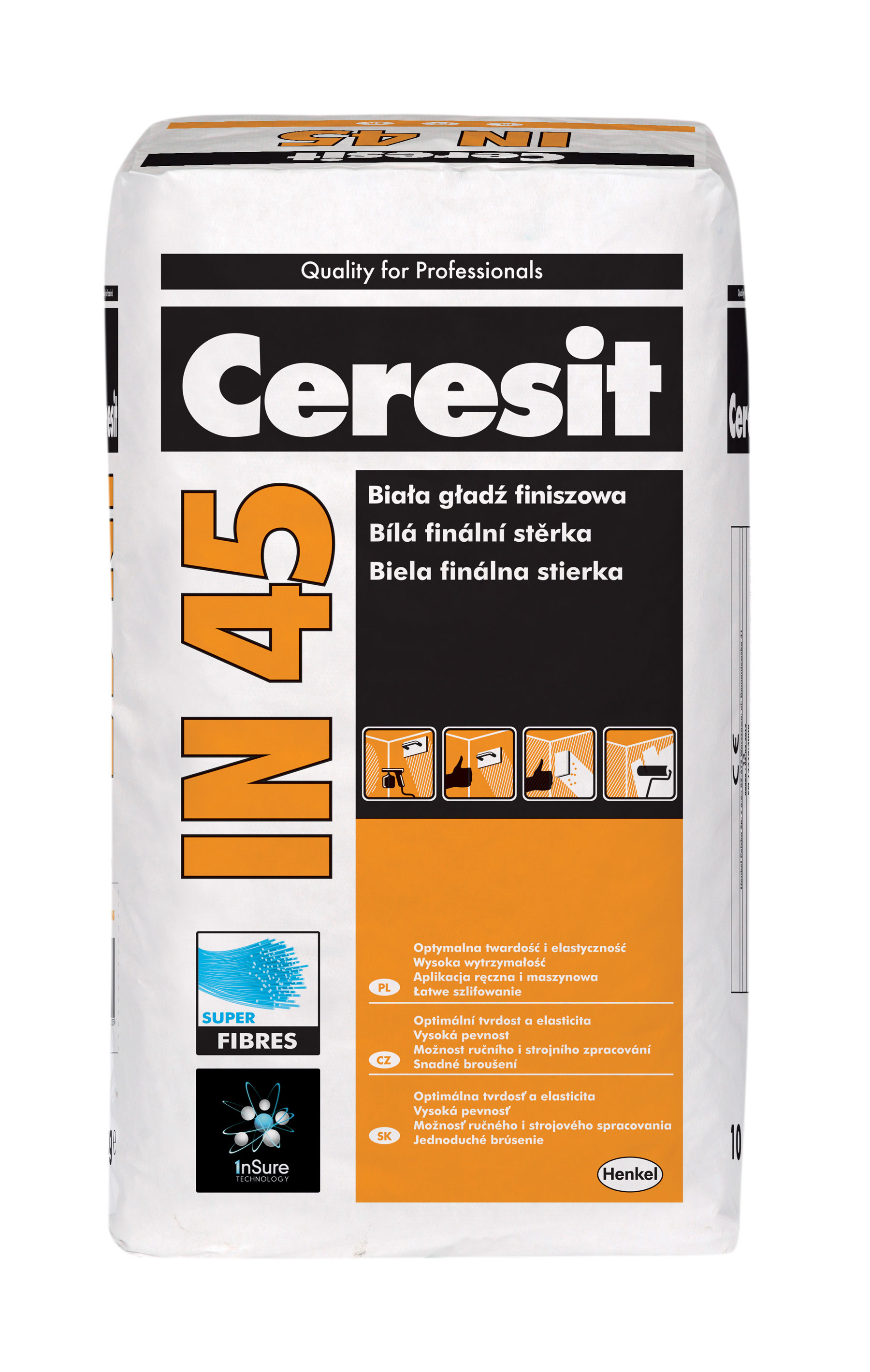 • Super fibres vlákna – pridaním špeciálnych vlákien je u stierky Ceresit IN 45 zaistená vysoká odolnosť po vytvrdnutí a je zabránené vzniku prasklín a odlamovaniu vrstiev