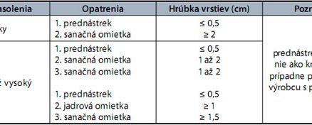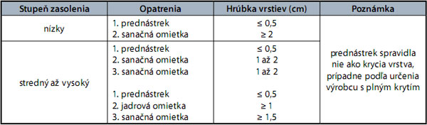 Uvedené typy omietok (prednástrek, jadrová omietka a štuková omietka) možno vyskladať do omietkového systému v závislosti od aktuálneho stavu vlhkosti a zasolenia muriva (tab. 1). Stupeň zasolenia sa stanoví a vyhodnotí na základe odobratých vzoriek muriva.