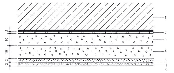 1 – podklad pre omietku, 2 – základný náter/adhézne činidlo, 3 – prvá omietková vrstva, 4 – druhá omietková vrstva, 5 – jemná vrstva, 6 – dekoračná vrstva