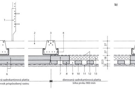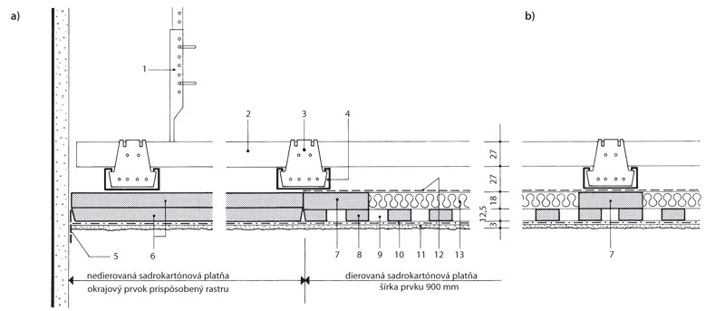 1 – Noniusov záves, 2 – základný profil 60 × 27, 3 – krížová spojka, 4 – nosný profil 60 × 27, 5 – deliaci pásik alebo pružné ukončenie škáry, 6 – okrajový prvok (nedierované sadrokartónové platne), 7 – pás zo sadrokartónovej platne (montážny mostík), 8 – sadrokartónová dierovaná platňa, 9 – usporiadanie otvorov 12/20/46, 10 – pás z rúna zo sklených vláken (prepúšťajúci zvuk), 11 – dekoračná omietka, 12 – hliníková fólia, 13 – minerálna vlna
