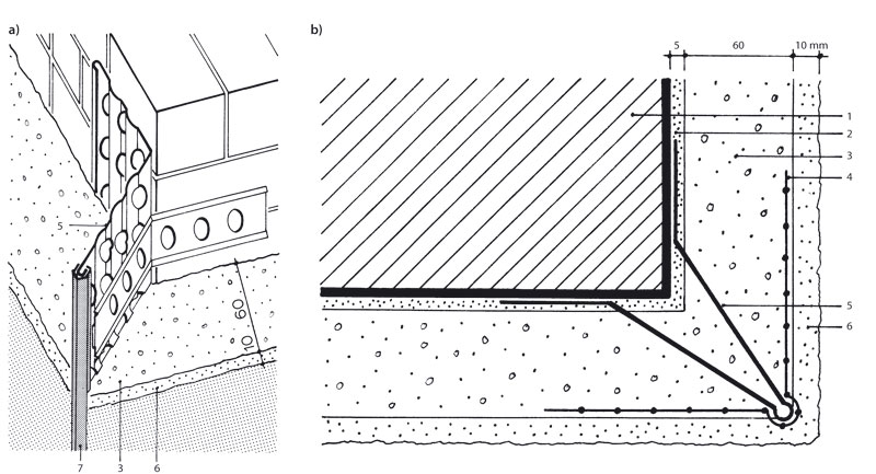 a) Ochranný profil hrany s povlakom z PVC; profil sa prilepí cementovou maltou na podklad. Malta nastriekaná pod tlakom sa prichytí z každej strany cez dierovanie v profile. Povlak z PVC sa neomieta a po ukončení omietania ho treba ihneď očistiť,