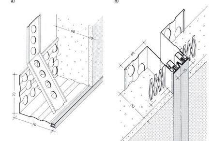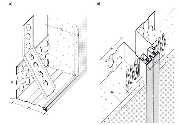 b) Ochranný profil hrany bez povlaku z PVC; tento profil je vhodný na vloženie do spodnej vrstvy, t. j. koľajnica sa neviditeľne zabuduje do tepelnoizolačnej omietky a pri hrane sa pridá pásik zo sklotextilnej mriežky ako prídavná výstuž. Konečná vrstva s hrúbkou 8 až 10 mm sa aplikuje okolo rohu.
