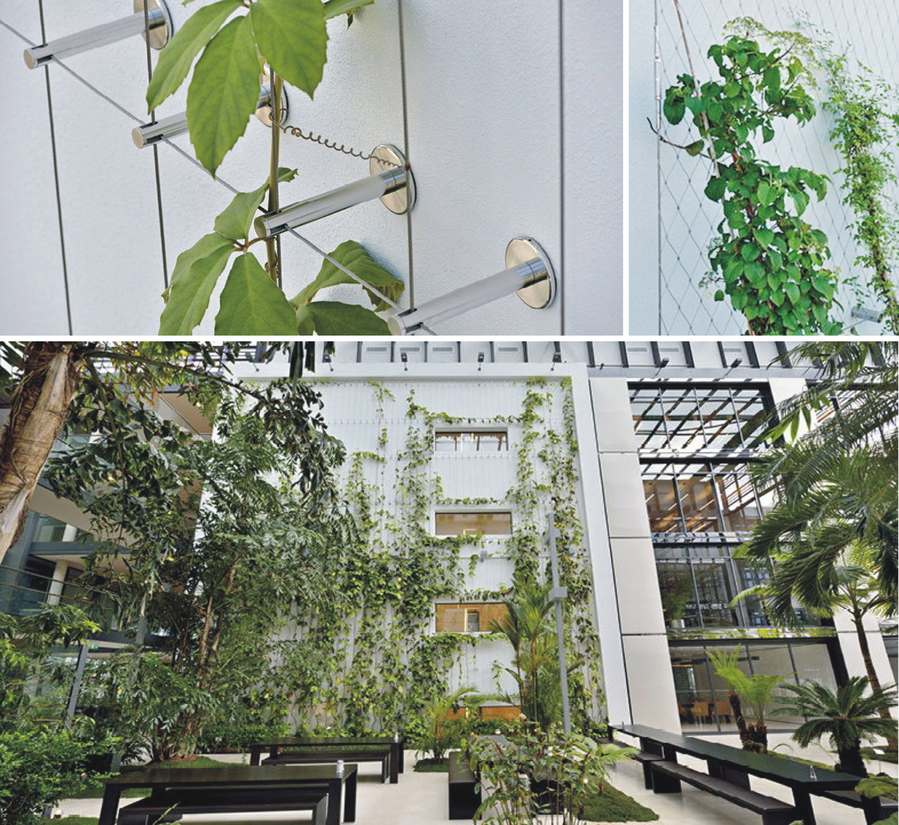 V tejto realizácii sú použité tiež antikorové čierne siete, ktoré dajú vyniknúť oceľovému rastru fasády budovy. V spodných úrovniach sme inštalovali antikorové laná, po ktorých sa rastliny navedú na antikorové siete a plynulo tak zazelenia línie únikových schodíšť smerom nahor  k horným poschodiam. Celá budova tak získa príjemnú a vyváženú kompozíciu.