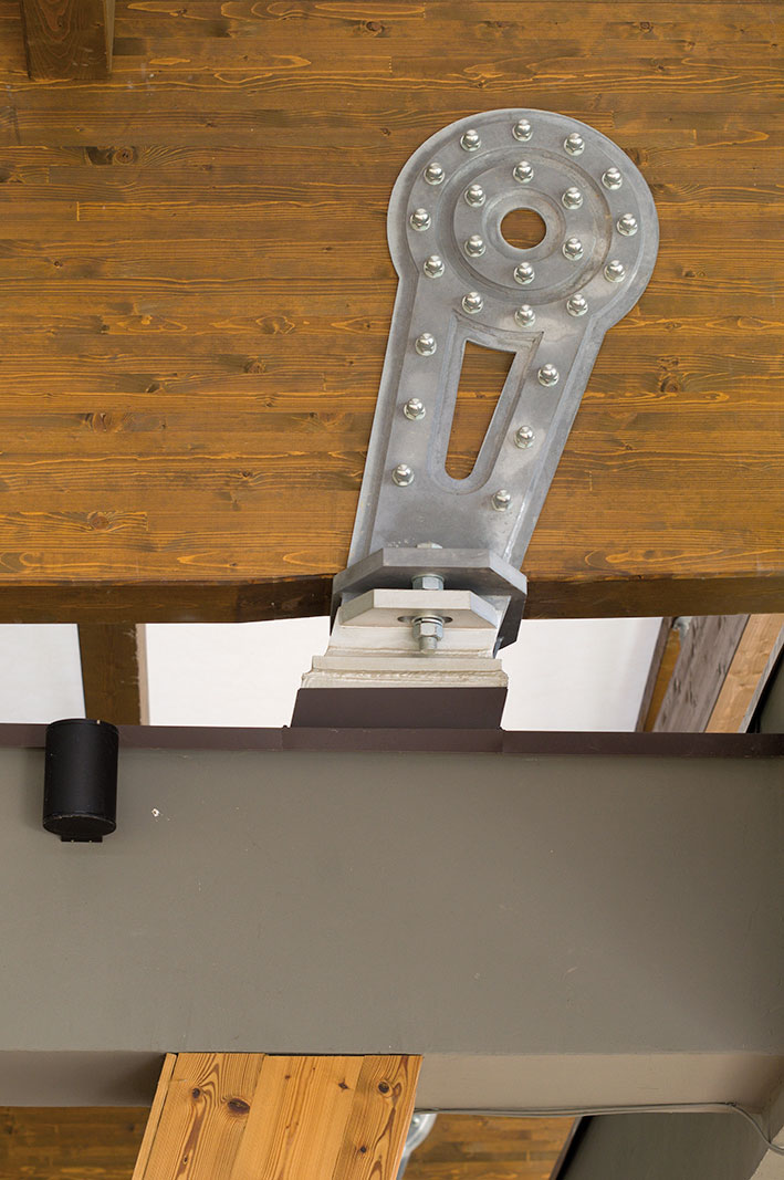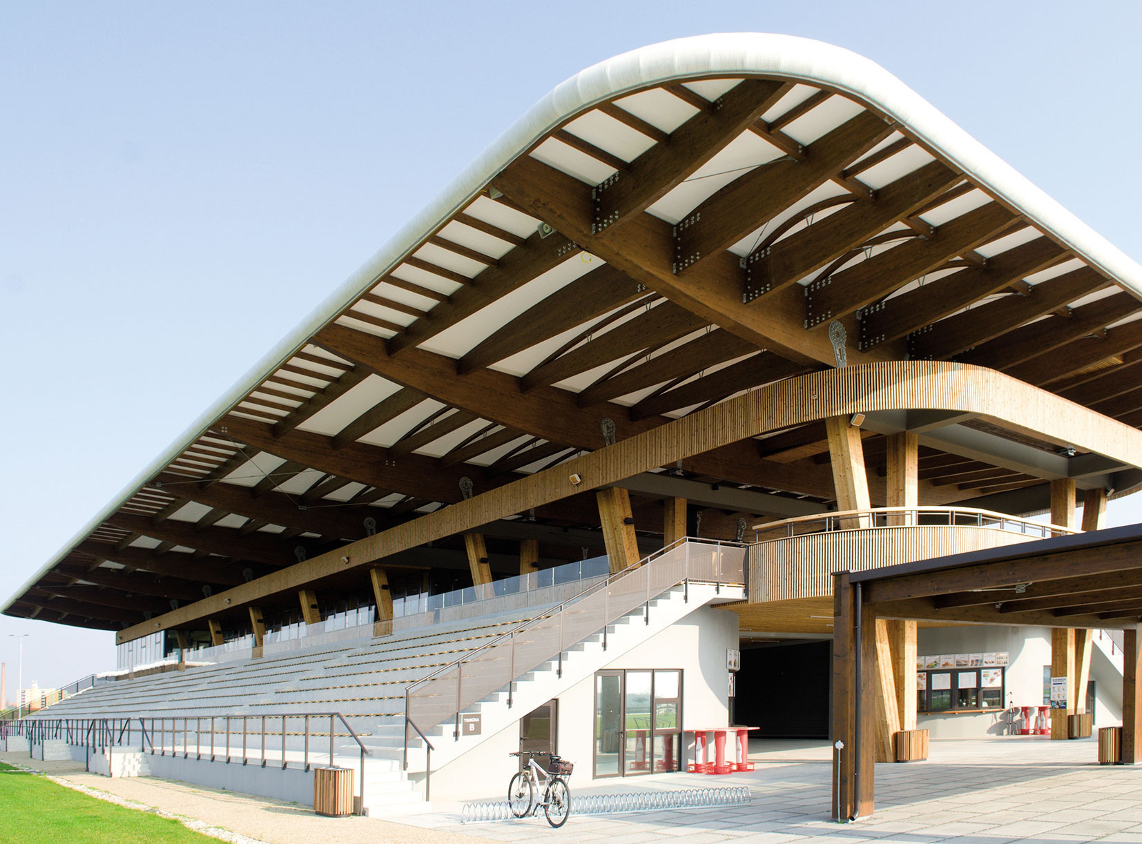 Aby sa zaistila požadovaná stavebnofyzikálna funkcia plášťa, jednotlivé funkčné vrstvy sa museli dôkladne prepojiť. Preto bol navrhnutý univerzálny spoj panelov, vďaka ktorému sa dali práce realizovať z exteriérovej strany, takže sa minimalizovali stavebné práce na pohľadovej strane. Vnútornú pohľadovú stranu vytvárajú trojstranne vyhobľované dosky s priznanou škárou so šírkou 10 mm, ktorá je vyplnená čiernou netkanou textíliou (na nepriesvitnosť škár). Obojstranná tribúna ma kapacitu 2 070 osôb a je riešená ako dvojpodlažná železobetónová konštrukcia zastrešená plochou strechou z lepeného lamelového dreva. Strešný plášť je tvorený bielou plachtou, ktorá je vypnutá pozdĺž celého obvodu.