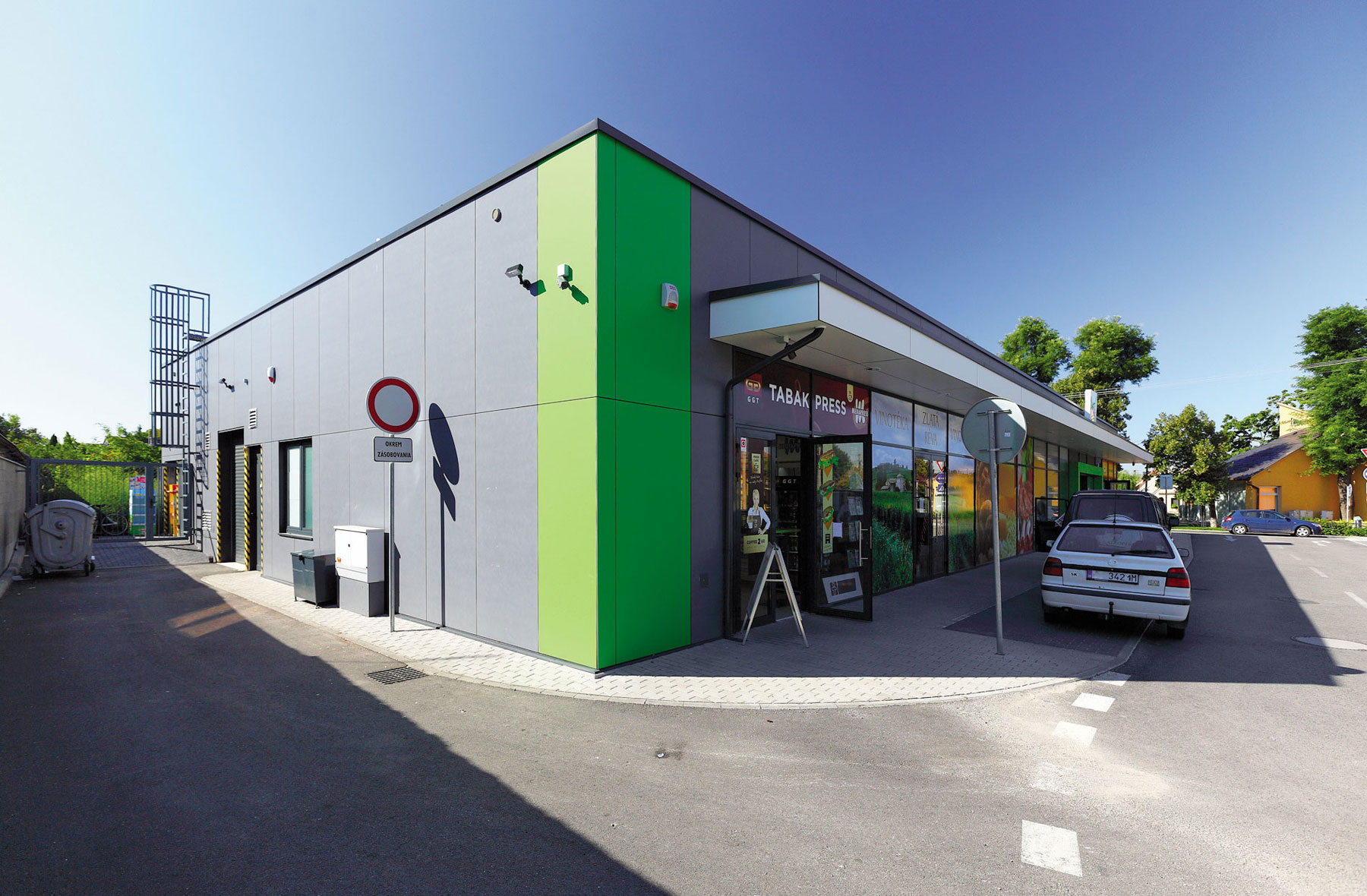 Novostavba predajne potravín má oceľovú konštrukciu opláštenú sendvičovými panelmi v kombinácii so zasklenými stenami. Reprezentatívnejší vzhľad stavby sa dosiahol použitím platní Swisspearl na fasádach orientovaných na námestie a na hlavnú ulicu. Fasádne panely majú RAL odtieň podľa dizajnového manuálu klienta, v tomto prípade išlo o sviežu kombináciu zelenej, sivej a bielej. Na rôznych stavbách po celom svete boli tieto panely použité vo vyše 2 000 farebných odtieňoch.Fasádne cementokompozitné panely sú namontované na hliníkovej konštrukcii, ukotvené lepením. Tvar samotných panelov tak vytvára raster bez rušivých spojov. Panely neobsahujú sklo, plast, kov, nie sú teda zdrojom statického elektrického náboja, ktorý by priťahoval prachové častice, takže sú bezúdržbové.