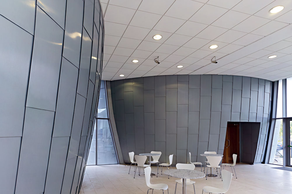 Ďalšou zvláštnosťou, respektíve výnimočnosťou je aplikácia materiálu RHEINZINK aj v interiéry objektu. Riešiteľ projektu sa rozhodol nechať navrhnutý organický tvar prednáškových sál prebiehať aj do interiéru spojovacích traktov. Aplikáciou toho istého materiálu pre opláštenie stien v exteriéri aj interiéri vznikla jedna kompaktná hmota tvarom i štruktúrou. Pre opláštenie povrchov v interiéri bol použitý materiál RHEINZINK predzvetranýpro modrošedý s úpravou INTERIEUR, hr. 0,8 mm.
