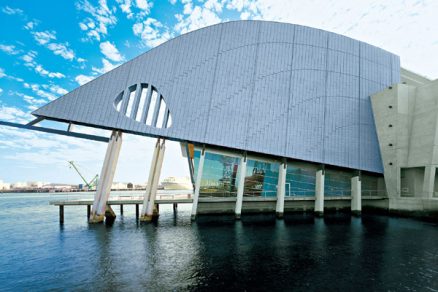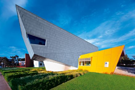 Prednášková miestnosť, Viktória Austrália. Do kompletného systému opláštenia sa podarilo zakomponovať okno. Vznikol tak zaujímavý detail, ktorý budovu oživil. Múzeum námorníctva, Perth Austrália