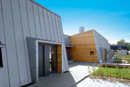 Budova materskej školy v Dánsku. Architekt konfrontuje drevo s metalickým opláštením založeným na uhlovej stojatej drážke. Prechody medzi drevom vyvolávajúcim pocit tepla a chladným kovom pôsobia harmonicky.V procese montáže je najdôležitejšia príprava realizácie. V rámci prípravy sa zhotoví kompletný kladačský plán fasády. V ňom sa vytýčia podkladové prvky nosného roštu a predpíše dilatácia. Podkladové konštrukcie umožňujú dodatočne vyrovnávať prípadné nerovnosti na fasáde. Pri realizácii prestupov opláštenia je nevyhnutné vopred určiť spôsoby, ako sa budú tieto prestupy realizovať. Mali by sa riešiť tak, aby sa umožnilo prevetrávanie fasády aj v priestore prestupov. Fasáda by mala prevetrávať prívod vzduchu pri úpätí, pri sokli a v mieste nadpražia. Odvetranie by sa malo realizovať podľa možnosti v najvyššom mieste opláštenia, napr. v mieste atiky, pri oknách pod parapetom. Pritom treba prihliadať aj na postup montáže fasádnych obkladov. Ak montujeme fasádne obklady zhora nadol, môžeme zároveň rozoberať lešenie. Ide o veľkú výhodu oproti montovaniu fasádnych obkladov zdola nahor. Vtedy je nevyhnutné domyslieť aj miesta ukotvenia lešenia.