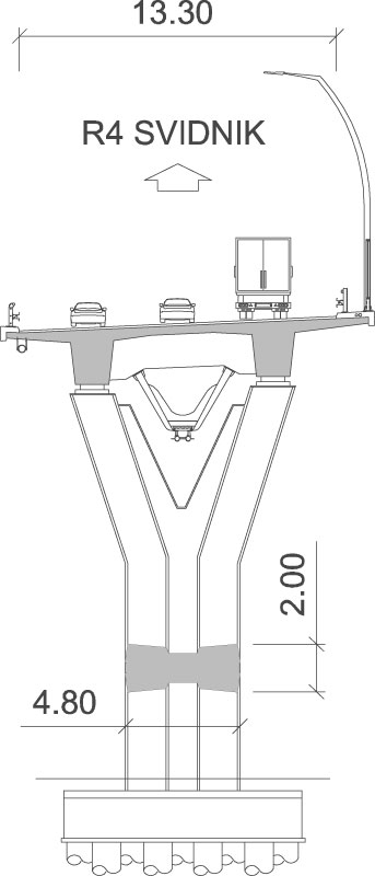 Mostný objekt sa nachádza na vetve č. 8 a z dialnice D1 zabezpečuje napojenie na rýchlostnú cestu R4. Je z monolitického predpätého betónu. Celková dĺžka mostného objektu je 536 m. Nosná konštrukcia je navrhnutá ako dvojtrámová. Most je dvanásťpoľový s rozpätiami polí 21 až 65 m. Nosná konštrukcia sa pôdorysne rozvetvuje do tvaru písmena Y. Premosťuje vetvy križovatky a cestu I/18. Rozpätie poľa nad týmito vetvami je 65 m. Pri zachovaní rovnakého typu nosnej konštrukcie pri pomerne veľkom rozptyle rozpätí boli v troch najväčších poliach navrhnuté externé predpínacie káble, ktoré vedú 2,5 m pod spodným okrajom nosnej konštrukcie v strede polí. Nad podperami týchto troch polí sú navrhnuté nábehy. Na zvýšenie tuhosti v krútení je na miestach nábehov dvojtrámová nosná konštrukcia, v spodnej časti doplnená spodnou doskou. Pri tvarovaní spodnej stavby sa rovnako ako pri iných mostoch križovatky dodržal motív písmena V.