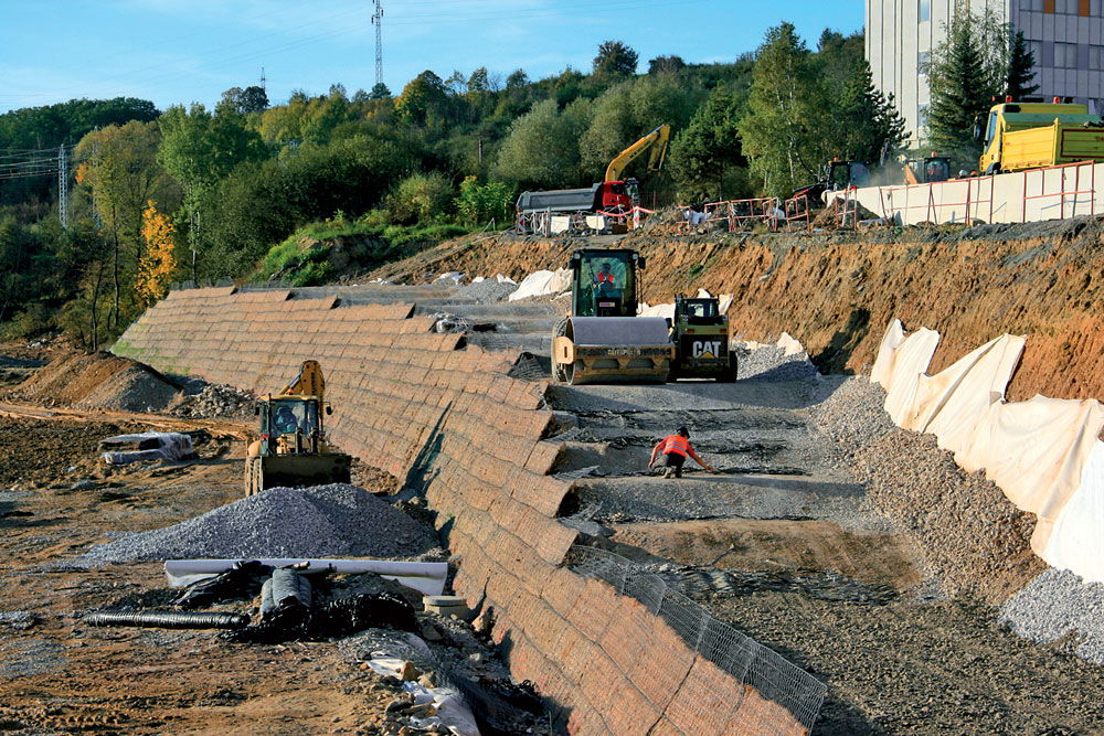 Na stavbe severného obchvatu Banskej Bystrice sa s využitím geosyntetických materiálov postavili aj dve oporné konštrukcie. Jeden oporný múr je z betónových prefabrikátov TW ortogonálneho tvaru, ktoré sú staticky zabezpečené geosyntetickou výstužou – tuhou geomrežou z HDPE. Druhý múr má konštrukciu typu GreenTerramesh (obr. 2) z betónových lícnych prefabrikátov.