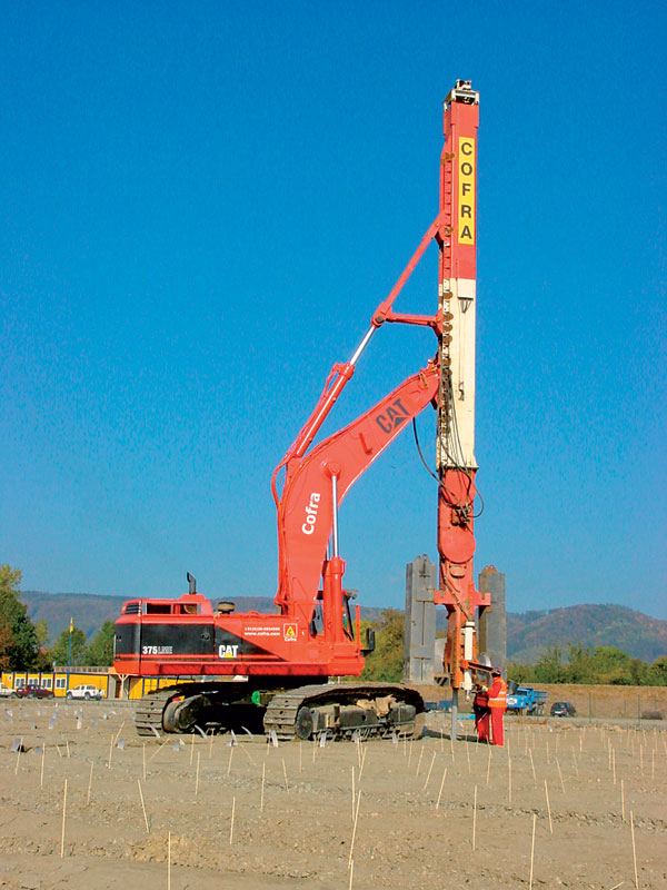 Z geosyntetických materiálov sa na stavbe R1 použili aj prefabrikované geodrény MebraDrain. Tento systém sa používa tam, kde sa očakáva pod zaťažením násypu veľké sadanie, ktoré má aj dlhý časový priebeh. V príspevku [7] je opísané zakladanie násypu na neúnosnom podloží, keď sa vertikálne prefabrikované geodrény zatláčali až do hĺbky 9,15 m. Prefabrikovaný geodrén MebraDrain (obr. 3) sa skladá z tuhého PP jadra v tvare H, ktoré je obalené netkanou geotextíliou z PP. Tá vytvára filtračný obal, ktorý zabraňuje kolmatácii drenážnych kanálikov. Vertikálne drény MebraDrain sa zabudovávali pomocou stroja s hydraulickou aplikačnou hlavicou (obr. 4).