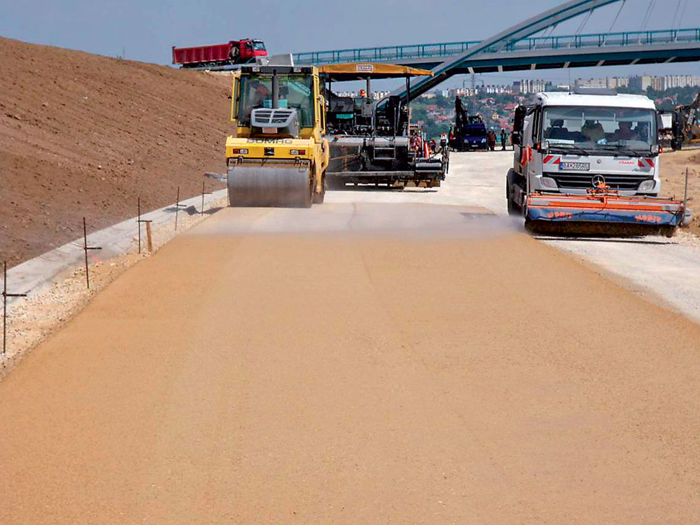 Zmes mechanicky spevneného kameniva MSK sa použila na stavbe vozovky na úsekoch cesty R1. Ide o kvalitnú zmes kameniva na nestmelené podkladové vrstvy, ktorá sa môže použiť aj pri vozovkách triedy dopravného zaťaženia I. až VI. Na stavbe R1 sa vrstva z MSK definovala ako MSK; 31,5 GB; 240 mm (STN 73 6126). Podľa preukaznej skúšky vyhovel návrh zmesi MSK so skladbou 55 %, frakcia 0/8 + 15 %, frakcia 8/16 + 30 %, frakcia 16/32. Takáto zmes mala po zhutnení maximálnu objemovú hmotnosť 2 253 kg/m3 a jej optimálna vlhkosť bola 4,8 %. Zmes sa vyrábala priamo v lome v mobilnej miešačke, ktorá mala pomerne veľký výkon (450 ton za hodinu). Na úseku sa zmes rozprestierala na drenážnu vrstvu zo štrkodrviny finišerom Vögele 2100. Zmes MSK sa kládla a zhutňovala vo dvoch vrstvách (približne 120 + 120 mm). Každá vrstva bola zhutňovaná vibračným valcom štyrmi, respektíve piatimi pojazdmi (obr. 5).
