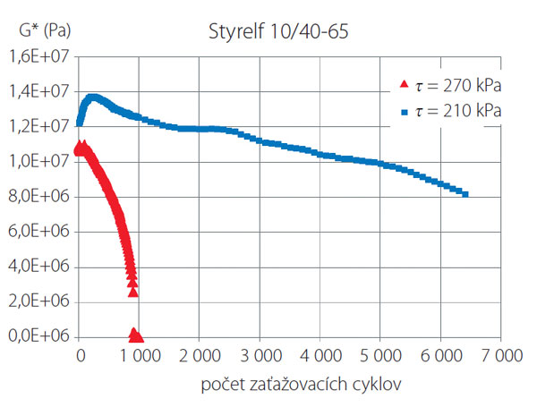 Na stavbe R1 sa použilo modifikované spojivo PmB 10/40-65. Skúšky únavy tohto spojiva sa vykonávali v špeciálnom prístroji pri dvoch úrovniach šmykového napätia τ = 210 kPa a 270 kPa. Záznam skúšky ukazuje závislosť komplexného šmykového modulu od počtu zaťažovacích cyklov (obr. 6). Vidieť na ňom, že pri menšom napätí je pokles relatívnej tuhosti zmesi pomalý.