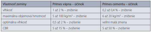Na tomto úseku cesty R1, ako aj na úseku Nitra, západ – Selenec sa vo veľkom rozsahu vykonalo „zlepšenie“ zemnej pláne hydraulickým spojivom. Ide v podstate o vylepšenie vlastností zeminy, ktorým možno dosiahnuť požadovanú (dobrú) únosnosť pláne pod konštrukciou vozovky. Spracovateľnosť a lepšie vlastnosti jemnozrnnej zeminy možno dosiahnuť primiešaním vápna, zvýšenie pevnosti zeminy hydraulickým zmesným spojivom alebo cementom. Možnosti úpravy podložia pri stavbe vozoviek aj s posúdením nákladov sú v príspevku [5]. Orientačné hodnoty zmien vlastností zemín po pridaní vápna alebo cementu sú uvedené v tab. 1.