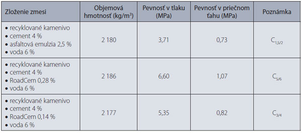 Problémy pri zavádzaní nových materiálov a technológií do praxe sa opisujú v príspevku [11], a to v súvislosti s návrhom modernizácie diaľnice D1 v ČR. V projekte rekonštrukcie vozovky sa navrhuje recyklovať po vybúraní cementobetónového krytu podkladovú vrstvu z cementovej stabilizácie na mieste za studena s pridaním cementu. Množstvo cementu sa uvažuje najviac 7 %. Hrúbka vrstvy cementovej stabilizácie (pôvodne SC I) je podľa prieskumu veľmi premenlivá (200 až 300 mm). Konečný návrh podkladovej vrstvy z recyklovanej stabilizácie sa ešte nevytvoril, ale podľa autorky príspevku nie je ani jasné, či treba postupovať podľa ČSN EN 14227 (v SR STN EN 14227-1), alebo podľa TP 208/2009 Recyklace konstrukčních vrstev netuhých vozovek za studena. V prípade prvého predpisu sa posudzuje (hodnotí) pevnosť v tlaku skúšobných telies po 28 dňoch, podľa druhého predpisu sa hodnotí pevnosť skúšobného telesa po siedmich dňoch v priečnom ťahu aj odolnosť zmesi proti účinkom vody a mrazu po 28 dňoch. Rozdielny je aj spôsob zhutňovania skúšobných telies. S cieľom porovnať vlastnosti zmesi recyklovanej cementovej stabilizácie sa v laboratóriu ČVUT vykonal rad laboratórnych skúšok. Ako spojivo použili cement (4 %), ale aj chemickú prísadu RoadCem a asfaltovú emulziu. Prehľad niektorých výsledkov skúšok je v tab. 2. Ako vidieť z prehľadu, pevnosti telies so 4 %-tami cementu sú po 28 dňoch relatívne malé a zmes by bola zaradená do triedy najviac C5/6, a to s prímesou RoadCem. Ďalšie skúšky treba urobiť aj s väčším množstvom cementu.