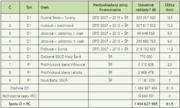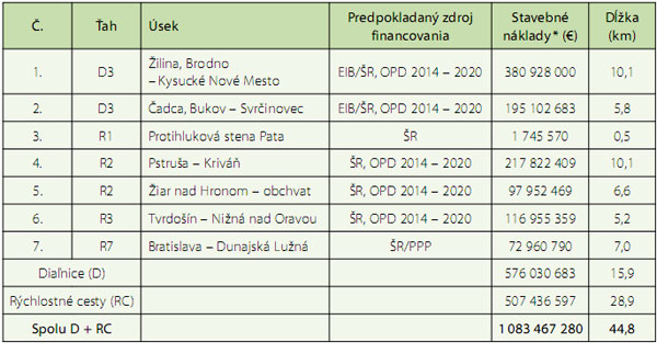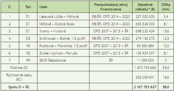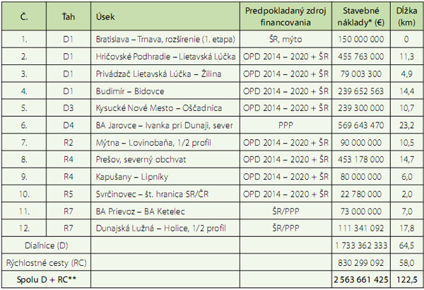 * Časť úsekov plánovaných na začatie výstavby v roku 2014 je zatiaľ v nízkom štádiu prípravy a zabezpečenie ich pripravenosti na výstavbu od roku 2014 aj s výkupmi pozemkov nemožno garantovať (je možný posun začatia na rok 2015).